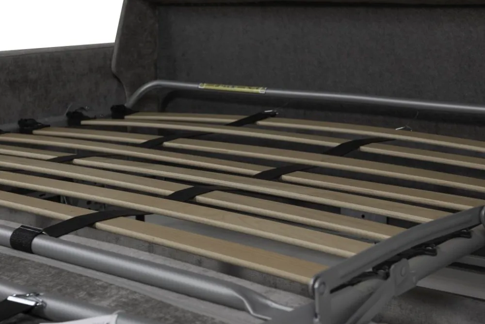 Zastosowany w modelu Carmen stelaż włoski w sofie to gwarancja niezawodności, łatwości obsługi i trwałości. Sofa rozkłada się w kilku prostych ruchach, co przedstawia intuicyjny system krok po kroku. Mechanizm rozkładania jest solidny i wytrzymały, a jego metalowa konstrukcja wsparta jest elastycznymi listwami sprężynującymi. To właśnie sofa ze stelażem włoskim zapewnia równomierne podparcie ciała podczas snu, zbliżone do tradycyjnego łóżka. Dzięki temu Carmen doskonale sprawdzi się nie tylko jako mebel okazjonalny, ale również do codziennego spania. Wysoka jakość wykonania mechanizmu przekłada się na jego wieloletnią trwałość.
