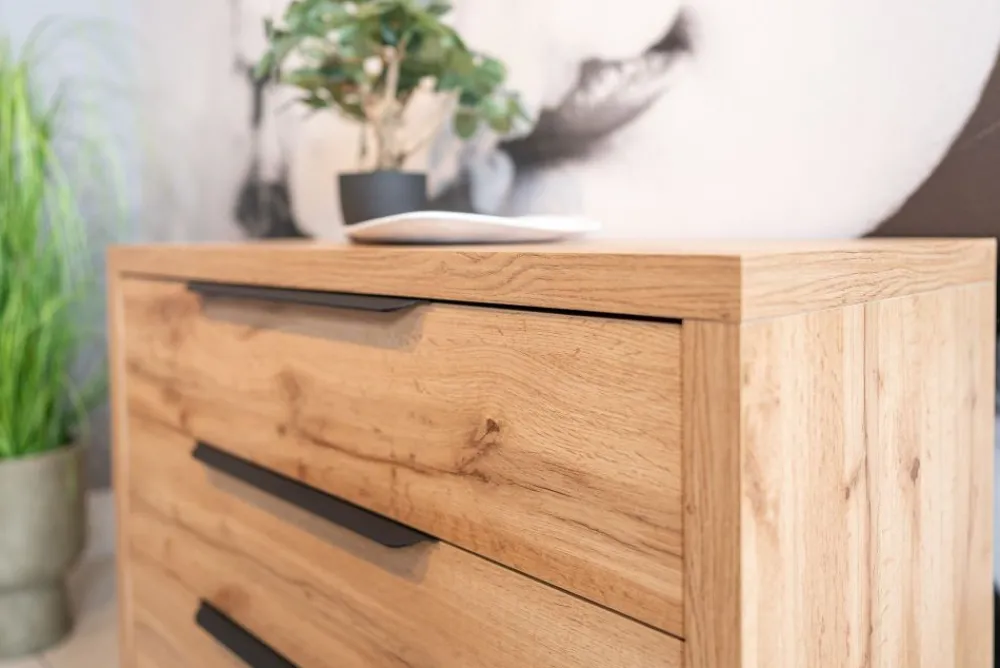 Szuflady komody zostały zaprojektowane z myślą o optymalnej organizacji i wygodzie użytkowania. Przestronne szuflady są idealne do przechowywania koszul, swetrów i akcesoriów, umożliwiając uporządkowanie każdego elementu garderoby. Dzięki temu możesz zorganizować swoją odzież i akcesoria zgodnie z własnymi preferencjami, zachowując porządek i estetykę.