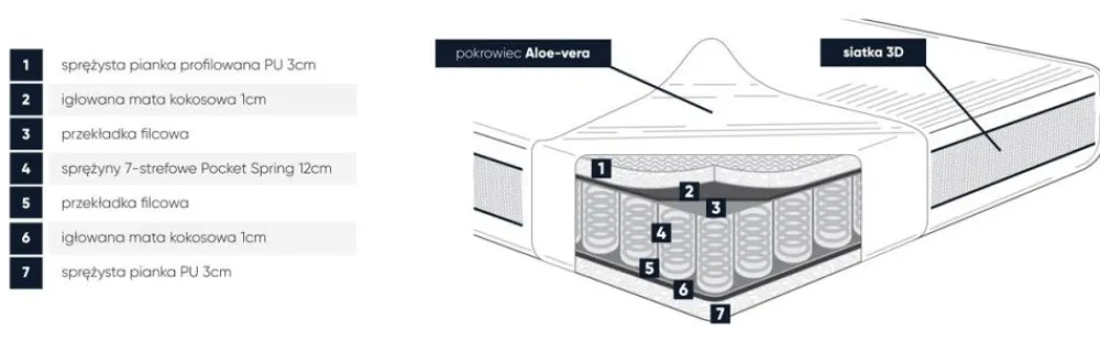 Jest materacem o nieco twardszym podłożu zbudowanym na podstawie kieszeniowych 7-strefowych sprężyn Pocket Spring wzmocnionych z obu stron igłowaną matą kokosową z naturalnego włókna kokosowego. Aby wzmocnić dodatkowy efekt elastyczności zastosowano tu 3-centymetrową warstwę profilowanej pianki poliuretanowej. Pas boczny z siatki 3D zapewnia właściwą wentylację i cyrkulację powietrza co zapobiega rozwijaniu się roztoczy, kurzu oraz szkodliwych mikroorganizmów.