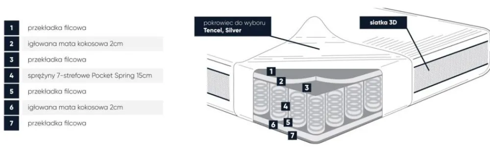 Materac o podwyższonej twardości dla osób preferujących twarde podłoże dla kręgosłupa oraz dedykowany klientom o wyższej wadze ciała. Niezależne sprężyny kieszeniowe 7-strefowe pocket spring są podstawą rdzenia materaca, a 2-centymetrowa płyta kokosowa tworzy z obu stron solidne podparcie, zachowując jednocześnie świetną cyrkulację powietrza. Mocna konstrukcja tego modelu zapewni trwałość i odporność na odkształcenia.