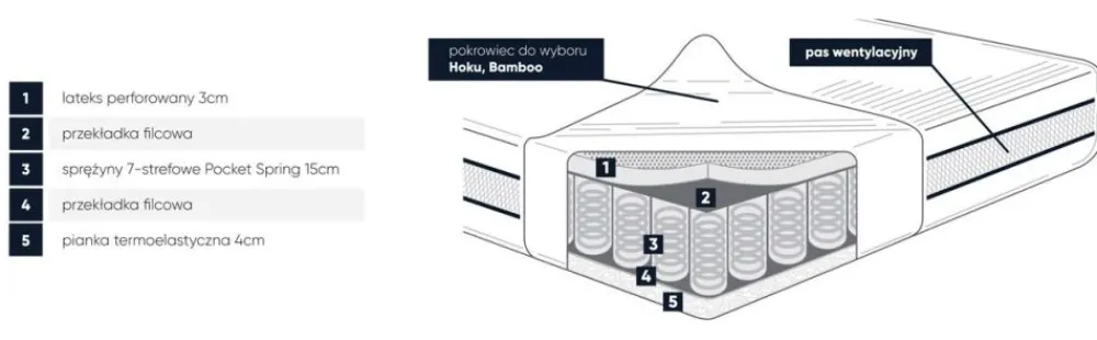 HOKU – Pokrowiec bardzo miły w dotyku o nowoczesnym geometrycznym wzorze, zabezpieczony apreturą w technologii BI-OME wykazuje właściwości antyalergiczne, przeciwbakteryjne i przeciwgrzybicze. Wbudowany boczny pas z siatki 3D zapewnia doskonałą wentylację i cyrkulację powietrza. Temperatura prania: 40 stopni Celsjusza.