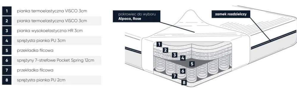 ALPACA – zastosowana w składzie dzianiny wełna z runa Alpaki nadaje jej niezwykłej miękkości i delikatności. Naturalnie kontroluje poziom ciepła oraz nie powoduje uczuleń i alergii. Bezpieczna powłoka w technologii BI-OME skutecznie hamuje rozwój bakterii, roztoczy i pleśni. Pokrowiec posiada zamek rozdzielczy ułatwiający odświeżenie w temperaturze 40 stopni Celsjusza.