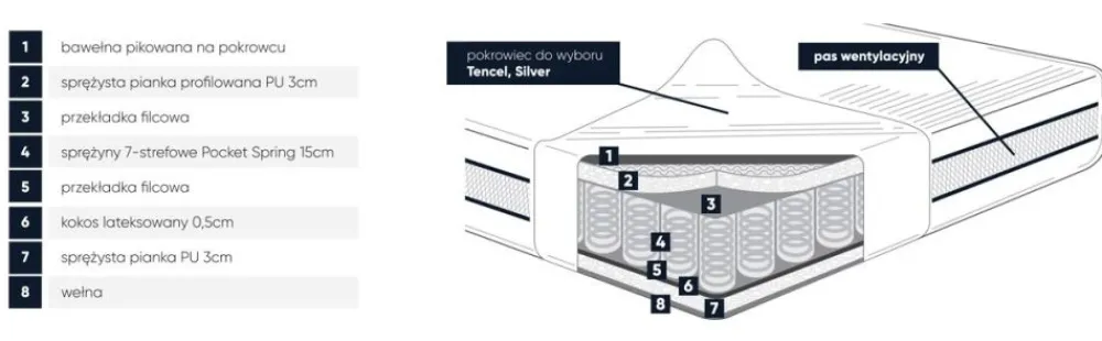 TENCEL – Naturalny, pokrowiec wykonany z włókien celulozowo-wiskozowych, nie podrażnia skóry i jest miły w dotyku, a ponadto dobrze absorbuje i oddaje wilgoć zapewniając cyrkulację powietrza. Powłoka Sanitized skutecznie eliminuje rozwój pleśni, bakterii i grzybów oraz zapobiega powstawaniu mikroorganizmów i roztoczy.