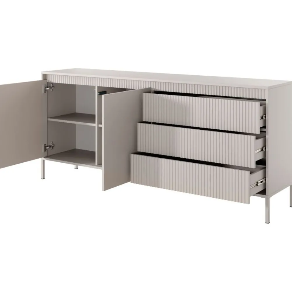 Komoda SENSO to idealny wybór dla osób ceniących nowoczesny design i funkcjonalność. Wykonana z wysokiej jakości płyty wiórowej laminowanej E05 w eleganckim beżowym odcieniu, harmonijnie komponuje się z różnorodnymi aranżacjami wnętrz. Fronty z płyty MDF o grubości 18 mm dodają solidności i estetyki, podkreślając jej nowoczesny charakter. System push-to-open eliminuje potrzebę uchwytów, dzięki czemu mebel wpisuje się w minimalistyczne trendy. Całość dopełniają smukłe, metalowe nogi w kolorze beżowym, które dodają lekkości i subtelnej elegancji.