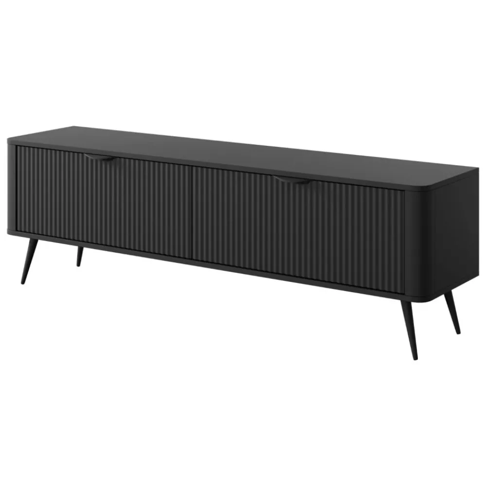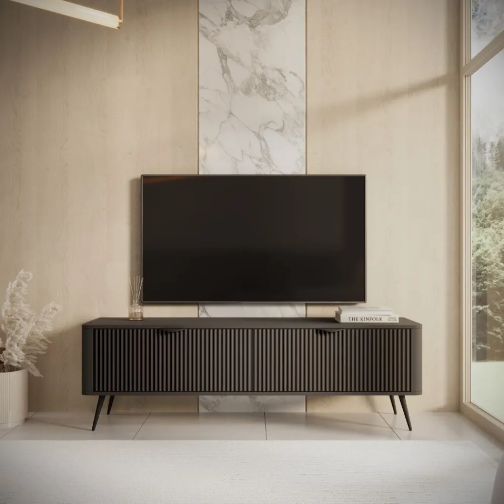 Szafka RTV Lante o szerokości 160 cm to propozycja dla miłośników minimalistycznego, ale wyrafinowanego stylu. Wykonana w eleganckim czarnym kolorze, z charakterystycznymi ryflowanymi frontami oraz subtelnymi uchwytami, prezentuje się niezwykle nowocześnie. Dzięki swojej kompaktowej formie mebel idealnie sprawdzi się w mniejszych salonach, pokojach dziennych czy sypialniach. Wysokie 18 cm metalowe nogi zapewniają stabilność i wygodę podczas sprzątania. Całość zachwyca prostotą formy i funkcjonalnością, zachowując przy tym wyjątkowy charakter kolekcji Lante. To idealna baza pod telewizor i niezbędne multimedia.