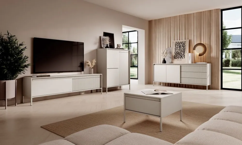 Beżowa szafka RTV z pojemnymi schowkami do salonu Senso