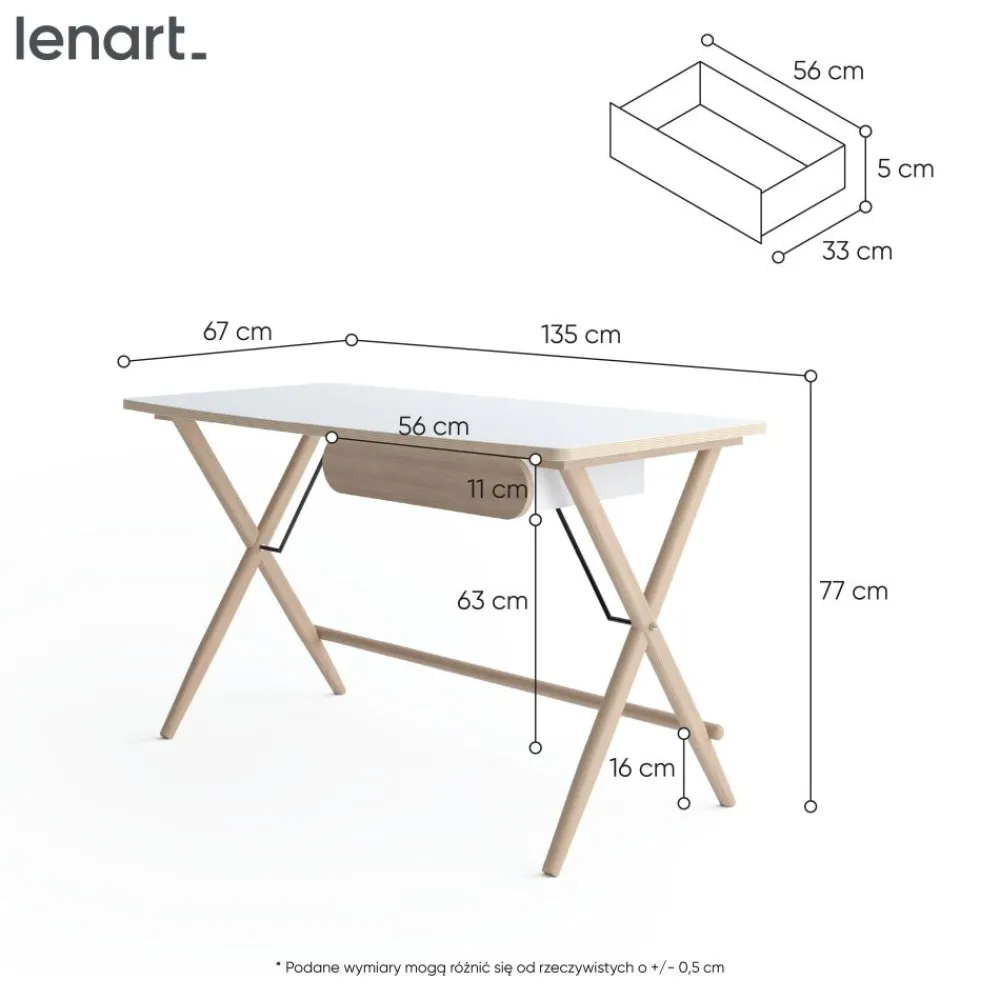 To nowoczesne biurko idealnie wpisuje się w skandynawski styl, łącząc minimalistyczny design z funkcjonalnością. Wykonane z laminowanej płyty wiórowej o białym wykończeniu, z eleganckimi dębowymi nogami, biurko wprowadza do wnętrza spokój i harmonię. Dzięki długości 135 cm i głębokości 67 cm, zapewnia wygodną przestrzeń do pracy, a jego wysokość 77 cm jest optymalna do codziennego użytkowania. Owalny front szuflady dodaje całości nowoczesnego charakteru, a praktyczna szuflada o wymiarach 56 cm x 33 cm x 5 cm pomieści wszystkie niezbędne akcesoria. To biurko dębowe to doskonały wybór do biura, pokoju dziennego lub sypialni, oferując wygodę i elegancję.