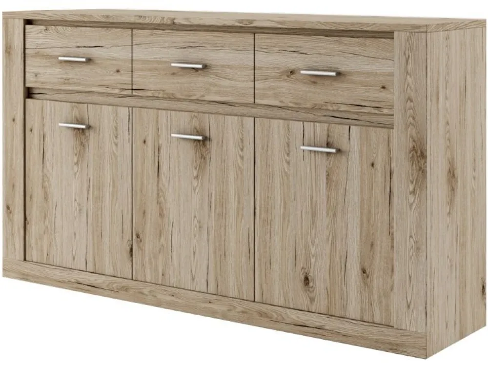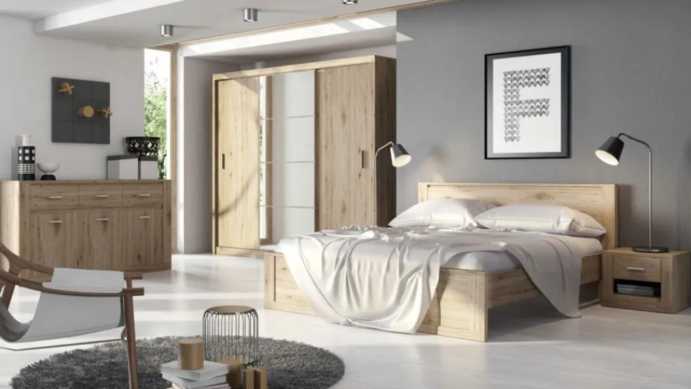 Komoda to niezastąpiony element każdej sypialni. Prezentowana wersja to konfiguracje z trzema pojemnymi szafkami i szufladami. Takie zestawienie to gwarancja udanej organizacji wszystkich ubrań i rzeczy osobistych.
