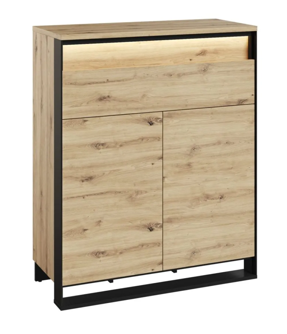 Czarne ramy, pełniące rolę solidnych podpór, są zarówno praktyczne, jak i wyjątkowo stylowe. Geometryczne nogi to nie tylko konstrukcyjny detal, ale również wyraz nowoczesnego designu, który wnosi do przestrzeni unikalny charakter. Dekor o naturalnym usłojeniu, w ciepłym odcieniu dębu artisan, nadaje komodzie naturalny i przytulny wygląd.
