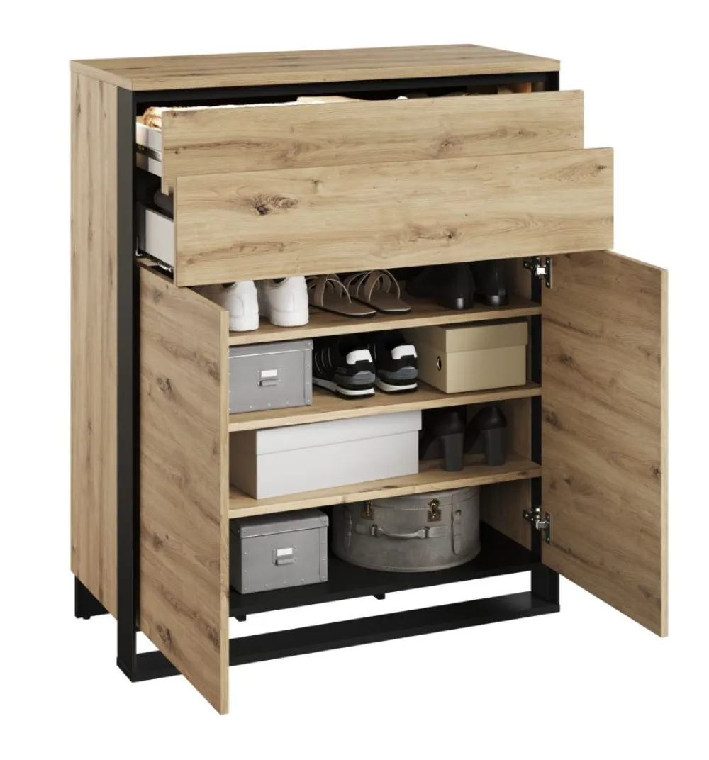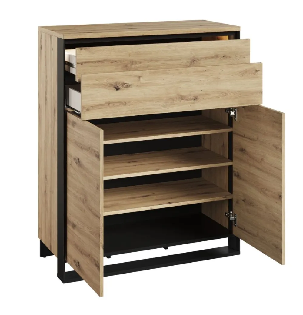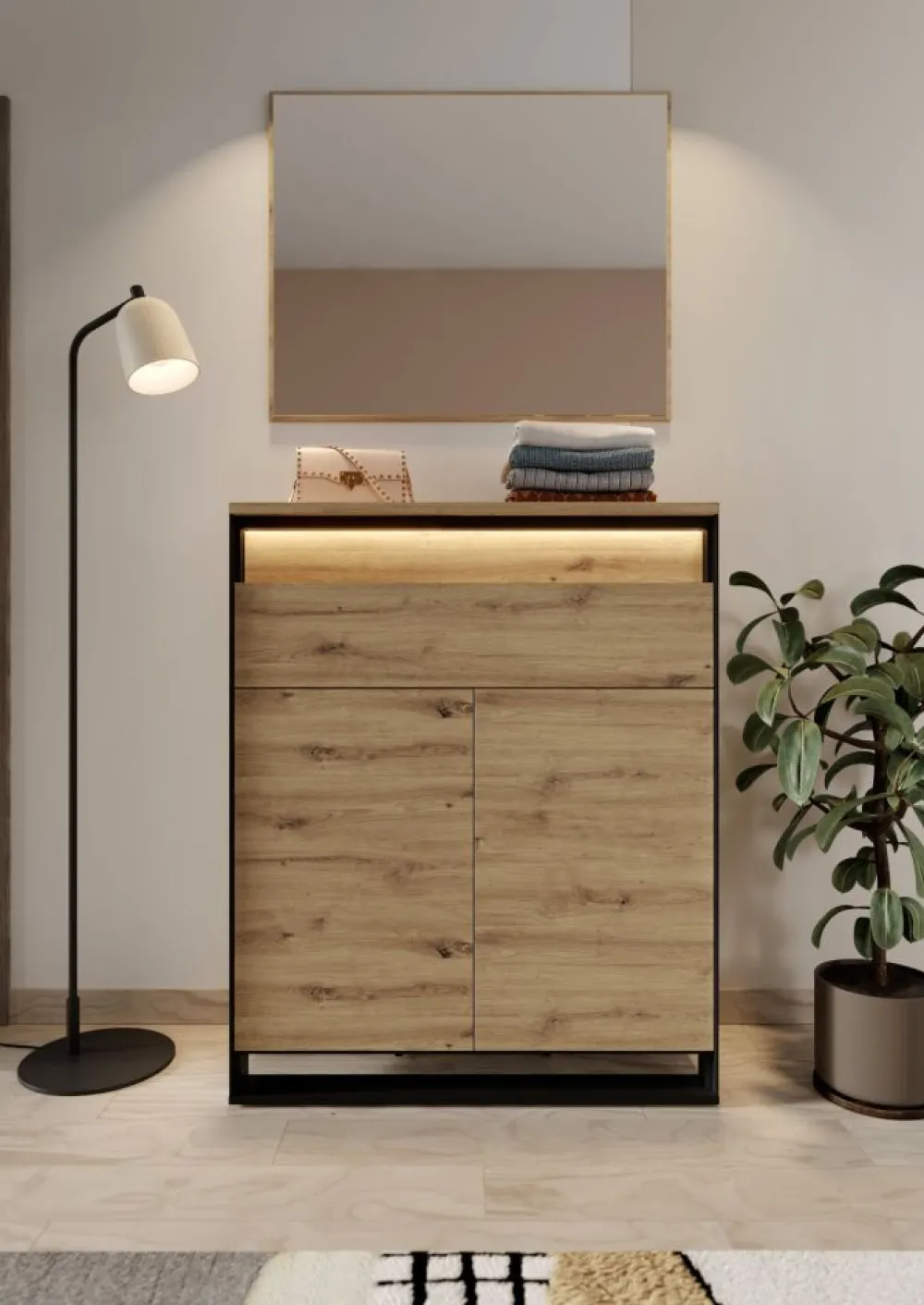 Komoda QUANT to prawdziwa skarbnica przestrzeni do przechowywania. Cztery półki na buty oraz dwie pojemne szuflady oferują mnóstwo miejsca na przechowywanie różnorodnych przedmiotów – od obuwia po drobne akcesoria. Przestrzenny styl frontów komody podkreśla subtelne oświetlenie LED, które nadaje wnętrzu niesamowity charakter.