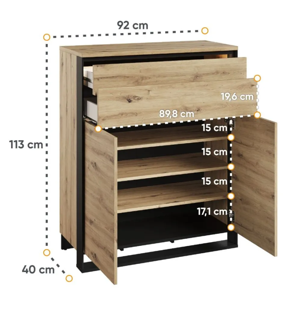 Ta komoda to połączenie solidności i estetyki. Wykonana z trwałej płyty wiórowej laminowanej, zachwyci Cię swoją trwałością. Kontrast między czarnym korpusem a ciepłym dębem artisan na froncie i blacie tworzy efektowną kompozycję kolorystyczną, która rewitalizuje przestrzeń.