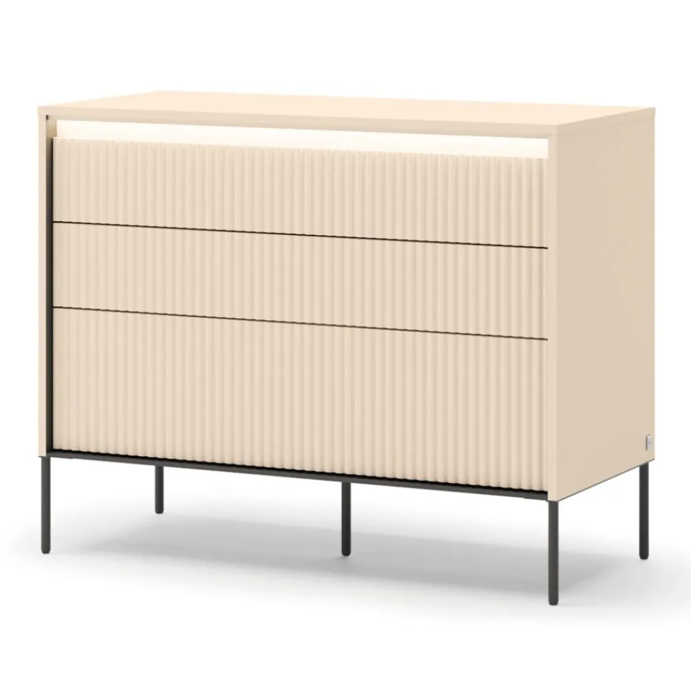Komoda z oświetleniem to stylowy element wyposażenia, który dodaje sypialni wyjątkowego klimatu. Subtelne światło LED podkreśla eleganckie ryflowane fronty, tworząc efektowną dekorację wnętrza. Oświetlenie nie tylko zwiększa estetykę mebla, ale także poprawia jego funkcjonalność, ułatwiając korzystanie z szuflad po zmroku. Możliwość regulacji intensywności światła pozwala dostosować nastrój pomieszczenia do własnych preferencji. To idealne rozwiązanie dla osób, które szukają designerskiego, a zarazem praktycznego mebla. Komoda z oświetleniem sprawi, że Twoja sypialnia nabierze nowoczesnego charakteru.