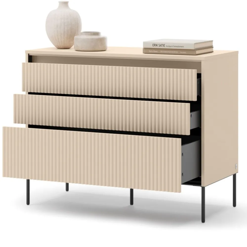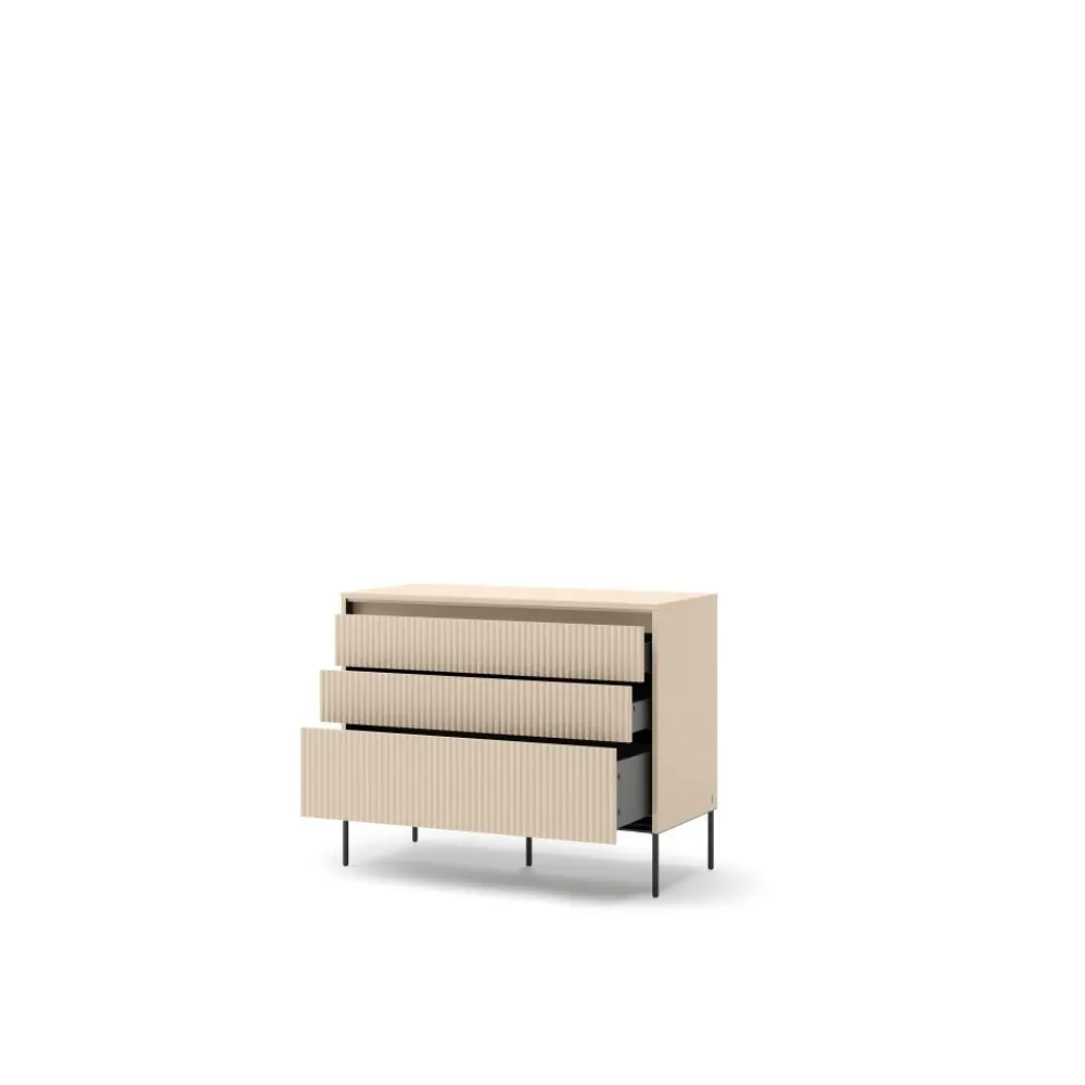 Komoda do sypialni to mebel, który łączy w sobie elegancję i praktyczne rozwiązania. Jej przestronne wnętrze pozwala na uporządkowane przechowywanie odzieży, pościeli czy innych niezbędnych przedmiotów. Ryflowane fronty nadają jej nowoczesnego charakteru, czyniąc ją wyjątkowym elementem dekoracyjnym. Komoda doskonale komponuje się z różnymi stylami aranżacyjnymi – od klasycznych po nowoczesne wnętrza. Dzięki wysokiej jakości materiałom i solidnej konstrukcji zapewnia długowieczność i wygodę użytkowania. To funkcjonalny mebel, który wzbogaci każdą sypialnię o nutę elegancji.