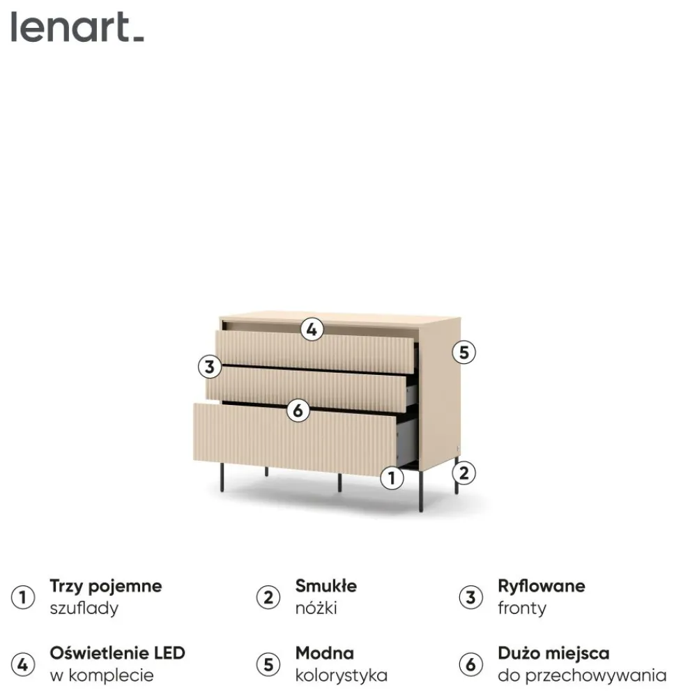 Komoda LED to propozycja dla miłośników nowoczesnych i funkcjonalnych rozwiązań w aranżacji wnętrz. Wbudowane diody LED zapewniają subtelne oświetlenie, które dodaje wnętrzu ciepła i przytulności. Ryflowane fronty w połączeniu z delikatnym światłem tworzą efektowny element dekoracyjny. Oświetlenie LED jest energooszczędne, co pozwala na długotrwałe użytkowanie bez wysokich kosztów energii. Dzięki temu komoda nie tylko wyróżnia się unikalnym wyglądem, ale także jest praktycznym dodatkiem do sypialni. To nowoczesne i stylowe rozwiązanie dla osób ceniących połączenie designu i wygody.