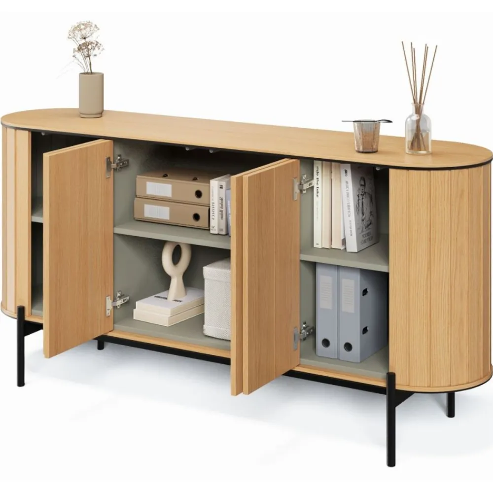Wprowadź do swojego wnętrza odrobinę luksusu i nowoczesności z naszą wyjątkową, dużą półokrągłą komodą w kolorze dąb vincenza, z czarnymi wstawkami oraz eleganckim wnętrzem w kolorze eukaliptusowym. Ta komoda to nie tylko mebel, ale także prawdziwe dzieło sztuki, które nada Twojemu wnętrzu wyjątkowego charakteru.