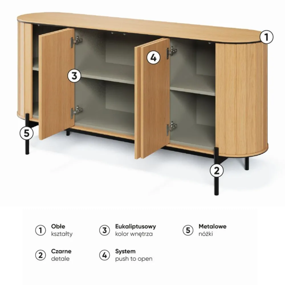 Główna część komody wykonana jest z wysokiej jakości materiału w kolorze dąb vincenza, który emanuje ciepłem i naturalnym urokiem. Eleganckie, czarne wstawki dodają komodzie wyrazistości i stylu, tworząc harmonijną całość. Wnętrze komody zostało starannie wykończone w kolorze eukaliptusowym, co dodaje jej nowoczesnego i świeżego wyglądu. Praktyczne półki i przestronne wnętrze pozwalają na przechowywanie różnych przedmiotów w elegancki sposób. Innowacyjny system otwierania push to open zapewnia wygodę użytkowania. Wystarczy lekki nacisk, aby otworzyć szafkę, co eliminuje potrzebę stosowania tradycyjnych uchwytów i podkreśla minimalistyczny charakter mebla. Komoda opiera się na solidnych, metalowych nogach w kolorze czarnym, które gwarantują stabilność i trwałość. Ich minimalistyczny design doskonale współgra z nowoczesnym wyglądem komody.
