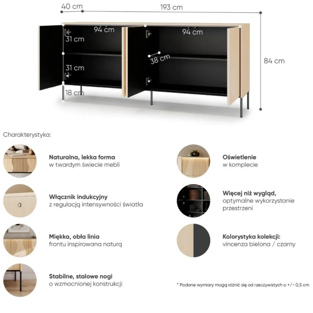 Wybierając czterodrzwiową komodę Flow FW-04, zyskujesz mebel, który w naturalny sposób organizuje przestrzeń Twojego pokoju dziennego. To propozycja stworzona z myślą o Tobie, jeśli zależy Ci na harmonii między estetyką a funkcjonalnością. Połączenie dębu Vincenza Bielona z czernią nadaje wnętrzu elegancki, nowoczesny charakter. Komoda świetnie wpisuje się w aktualne trendy aranżacyjne i stanowi spójny element wyposażenia salonu. Jej wyważona bryła prezentuje się solidnie, ale nie przytłacza wnętrza. Dzięki temu z łatwością dopasujesz ją zarówno do większych, jak i bardziej kameralnych przestrzeni.