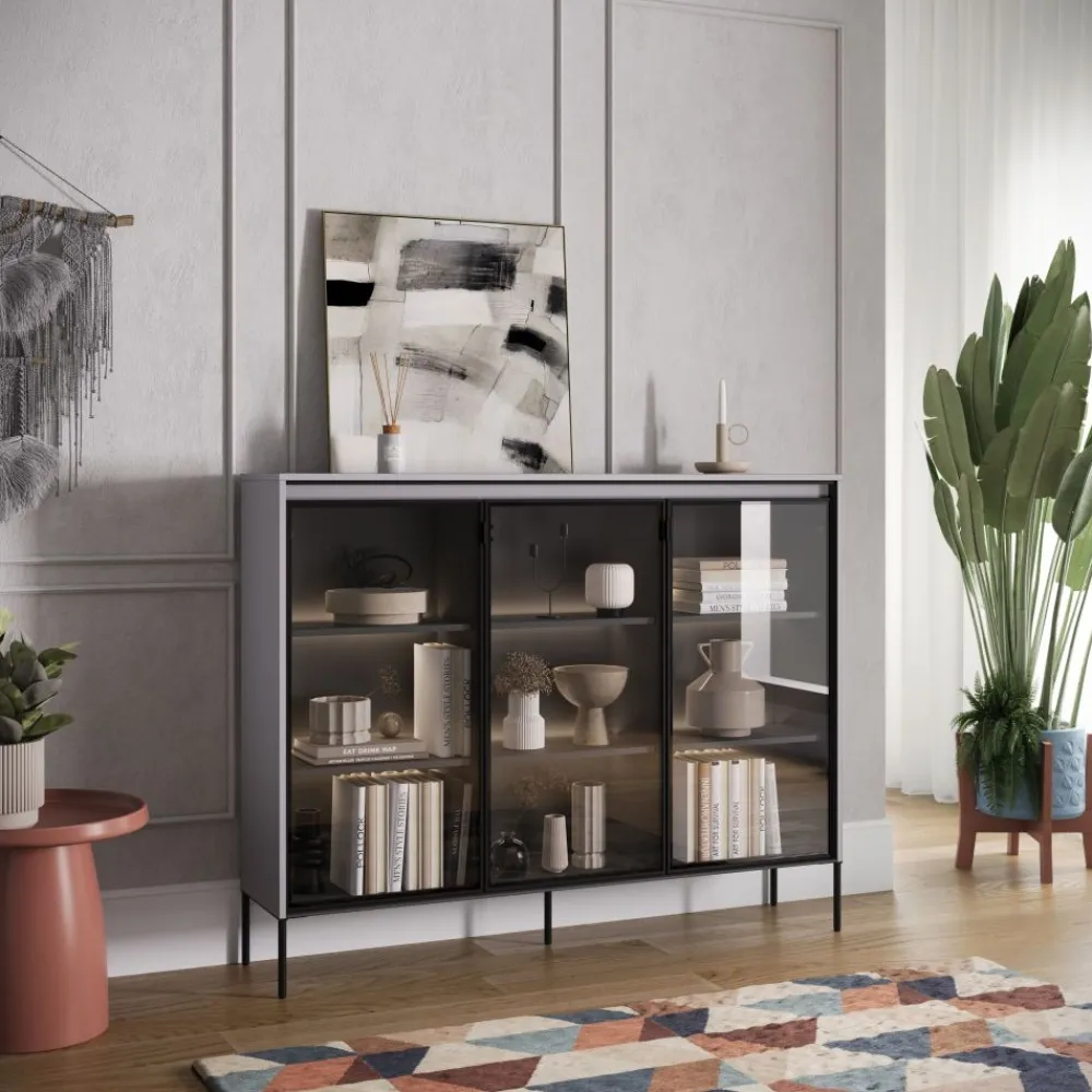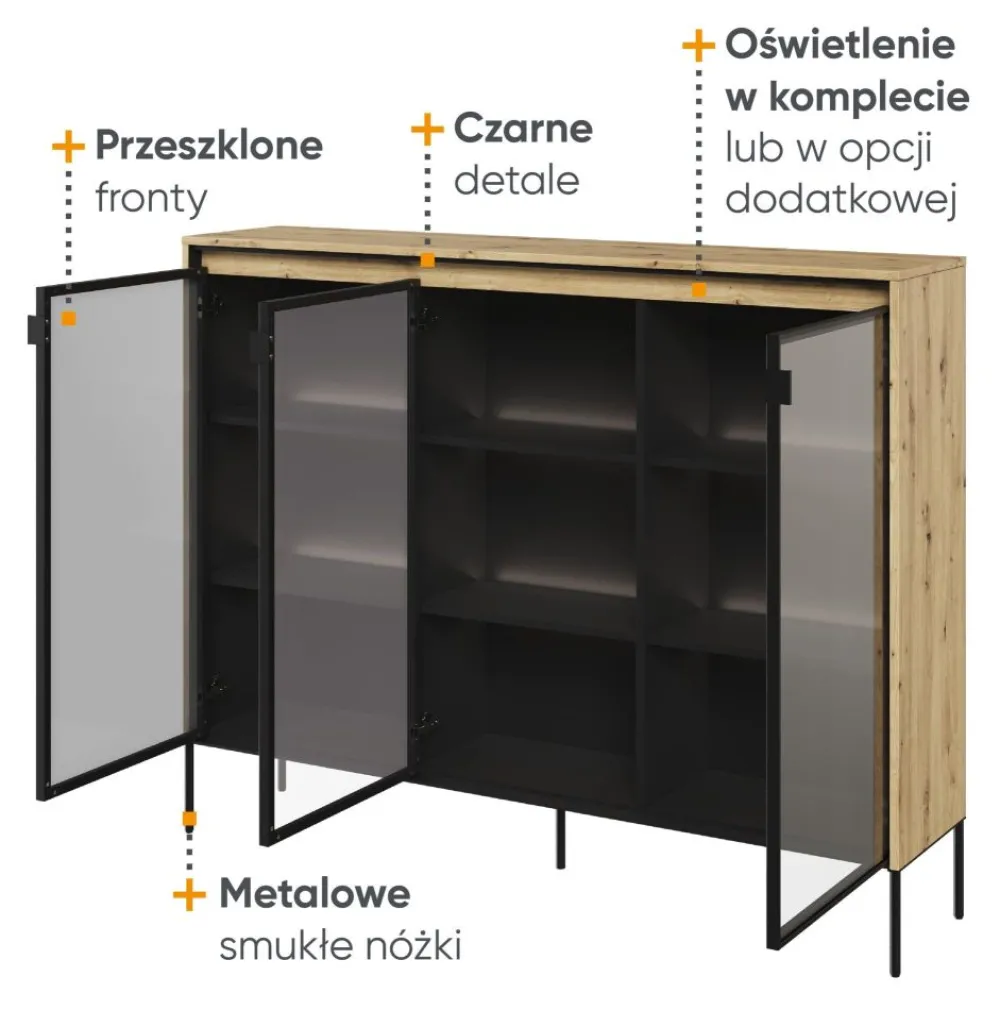 Szukasz czegoś więcej niż zwykłej komody? Przeszklona komoda z kolekcji TREND to rozwiązanie, które nie tylko spełni Twoje praktyczne potrzeby, ale także dodaje wyjątkowego uroku Twojemu wnętrzu. Ta unikalna komoda wyróżnia się przeszklonymi frontami, które pozwalają na efektowną prezentację Twoich ulubionych przedmiotów, dekoracji i kolekcji.