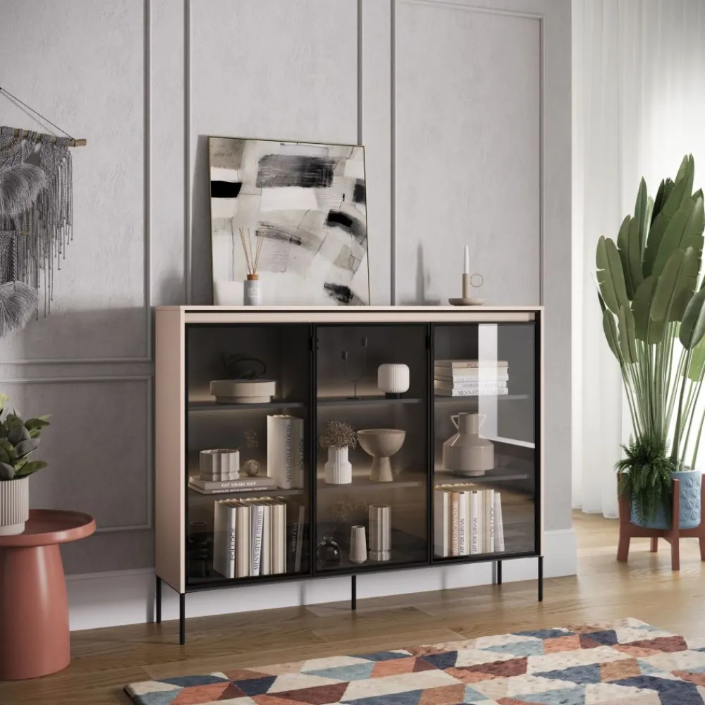 Przeszklona komoda z kolekcji TREND została starannie wykonana z wysokiej jakości materiałów, co zapewnia nie tylko jej trwałość, ale także solidność. Dzięki temu mebelowi możesz być pewien, że służyć Ci będzie przez wiele lat. Dodatkowo, komoda jest wyposażona w oświetlenie LED, które tworzy nastrojowy klimat w Twoim wnętrzu. Opcjonalnie, możesz również dodać oświetlenie umieszczone za półkami wewnętrznymi, aby jeszcze bardziej podkreślić wyjątkowość prezentowanych przedmiotów.
