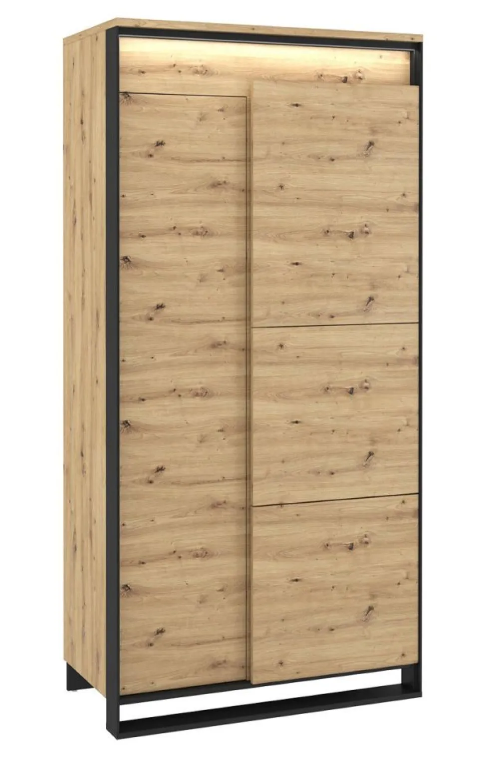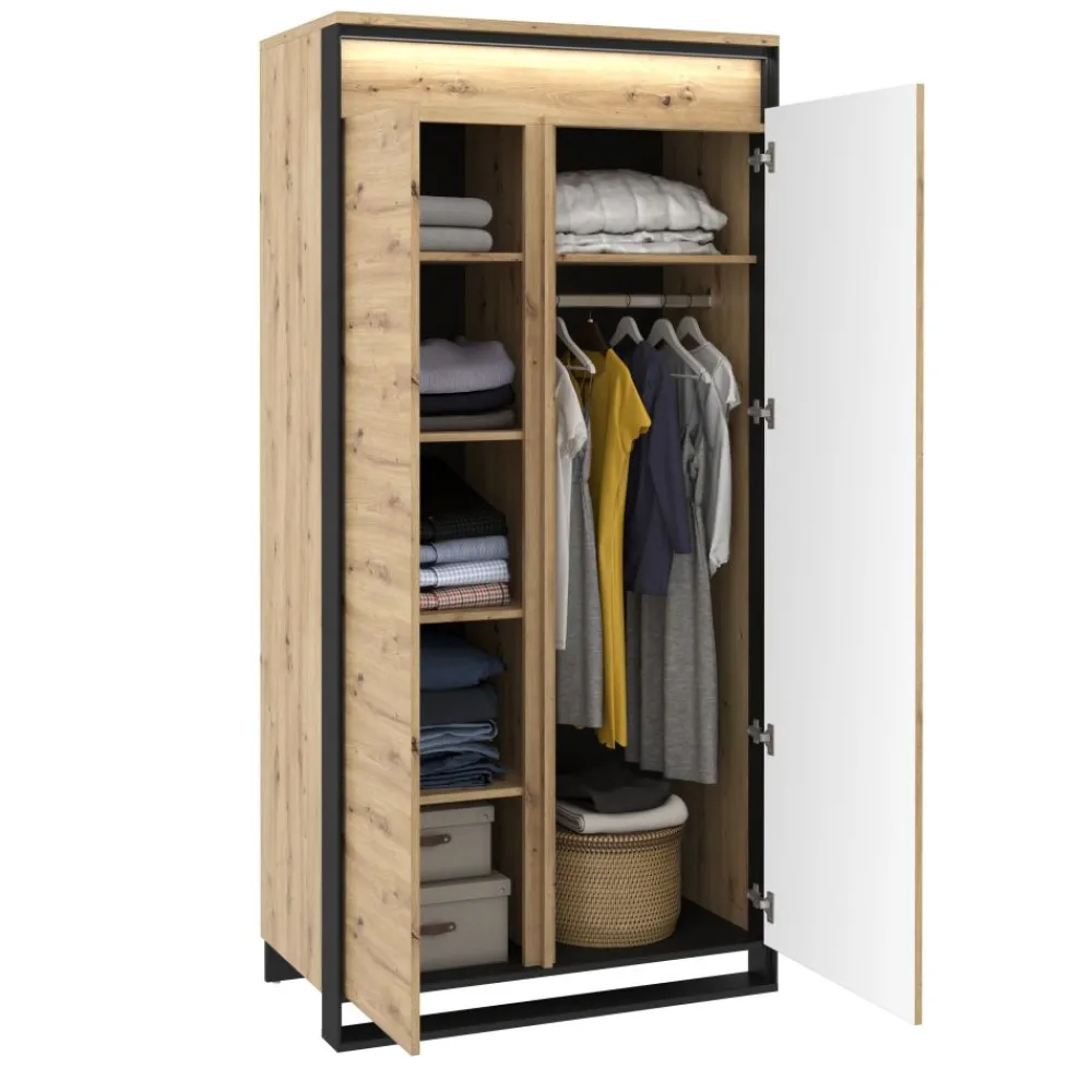 Szafa Quant wyposażona jest w półki po jednej stronie, a po drugiej w półkę i drążek do wieszania ubrań. Gabaryt szafy pozwoli na wszechstronne wykorzystanie – mebel znajdzie swoje miejsce w salonie, sypialni lub przedpokoju. Dodatkowym atutem jest ozdobne oświetlenie LED w górnej części szafy. Mebel wykonano z wytrzymałej płyty laminowanej wykończonej trwałym obrzeżem ABS. Komfortowe użytkowanie wspomaga mechanizm PUSH TO OPEN.