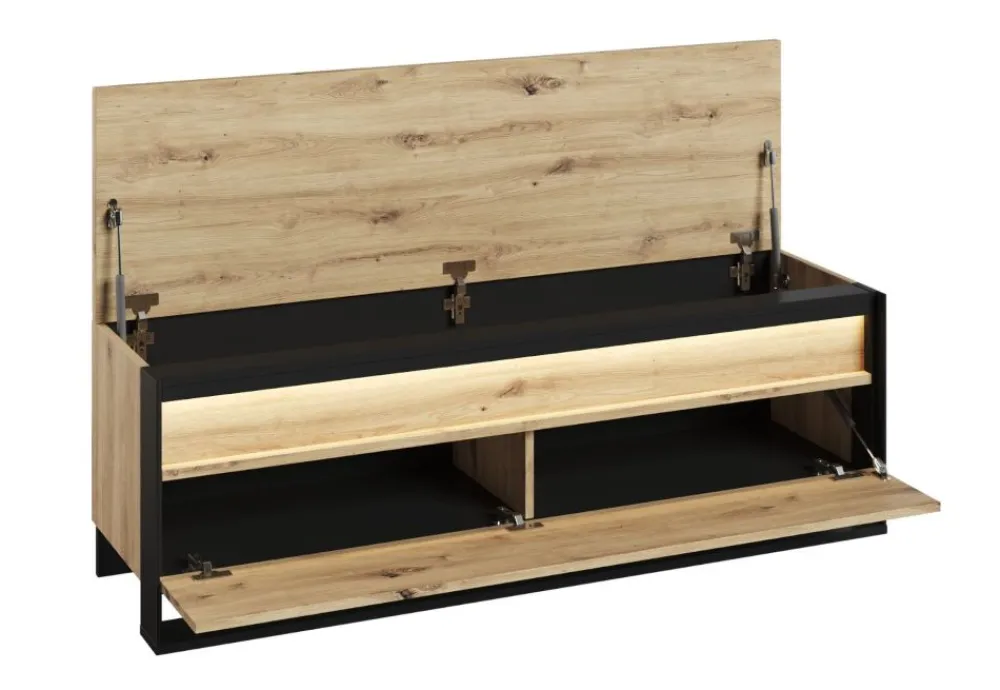 Szafka na buty QUANT została starannie wykonana z najwyższej jakości materiałów. Korpus z płyty wiórowej laminowanej zapewnia wyjątkową trwałość i solidność, co jest gwarancją, że mebel posłuży przez wiele lat. Kontrast między czarnym korpusem a ciepłym dębem artisan na froncie i blacie tworzy niepowtarzalne, piękne zestawienie kolorystyczne, które przyciąga wzrok i dodaje wnętrzu charakteru.