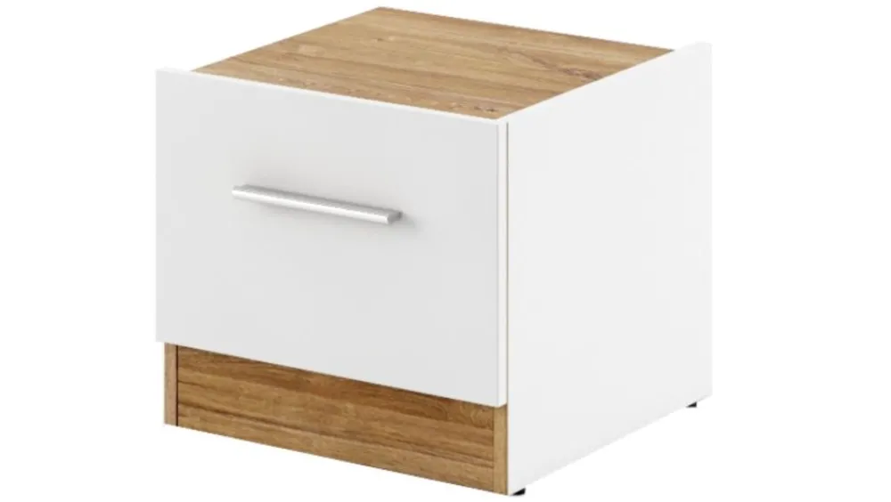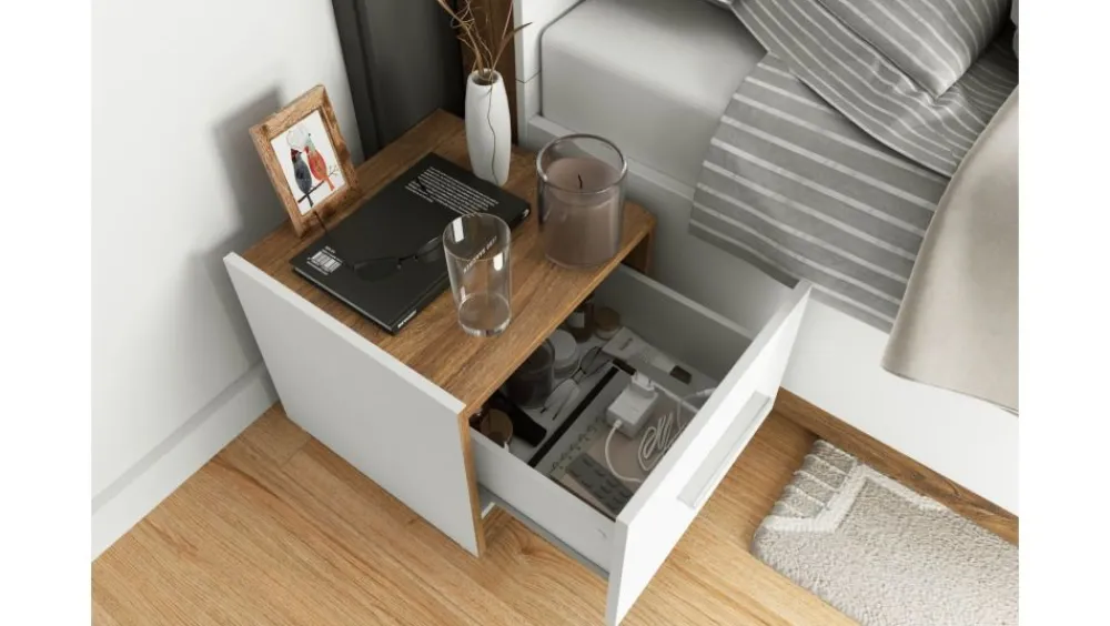 Uzupełnieniem łóżka jest szafka nocna, która dzięki pojemnym szufladom, sprawdza się jako organizer do rzeczy osobistych. Na stoliku bez problemu postawimy lampkę nocną oraz drobne dekoracje, znajdzie się też miejsce na ulubioną książkę.