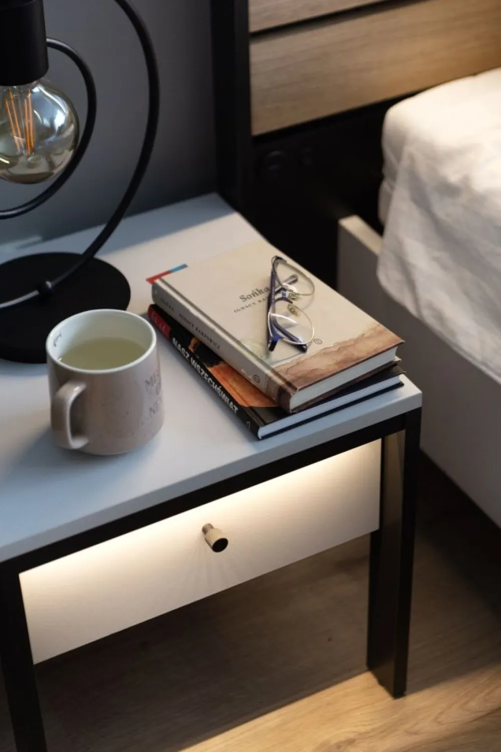 Wszystko to dopełnia oświetlenie, które nie tylko dodaje szafce nocnej funkcjonalności, ale także tworzy atmosferę intymności w sypialni. Delikatne światło pozwala stworzyć przytulne otoczenie, idealne do relaksu po długim dniu.