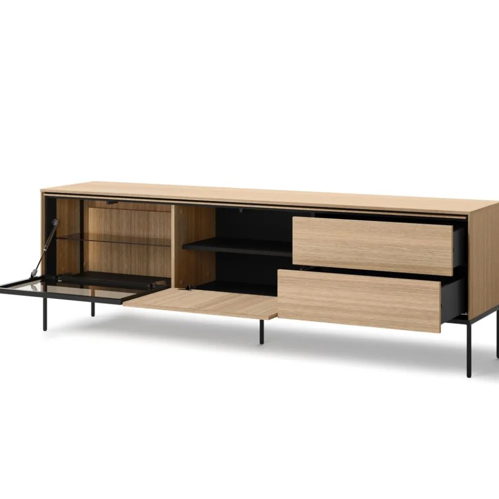 Szafka RTV VISSO VI-07 na wysokich nogach nie tylko dodaje lekkości i elegancji, ale również zapewnia stabilność i bezpieczeństwo dla Twojego sprzętu multimedialnego. Wytrzymałe materiały gwarantują, że szafka utrzyma nawet większy telewizor, zapewniając jego stabilne położenie. Dzięki przestronnym półkom i szafkom masz pewność, że wszystkie urządzenia i akcesoria znajdą swoje miejsce, tworząc uporządkowaną i estetyczną przestrzeń. Kolor dąb linearny świetnie komponuje się z innymi meblami, dodając ciepła i naturalnego uroku Twojemu salonowi. To idealna szafka RTV do salonu, która łączy nowoczesny wygląd z funkcjonalnością i bezpieczeństwem.