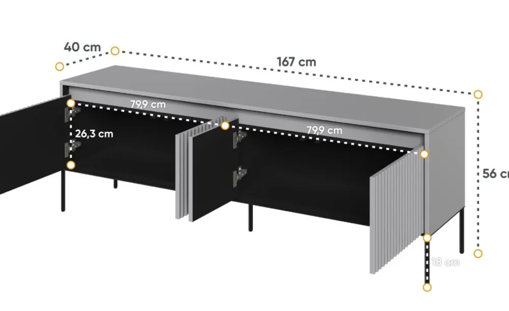 Ta szafka została zaprojektowana z myślą o najwyższej funkcjonalności. Posiada cztery przestronne szafki, które pomogą Ci w zorganizowaniu kabli, płyt DVD i innych drobnych przedmiotów. Dzięki temu, Twój salon stanie się bardziej uporządkowany i estetyczny.