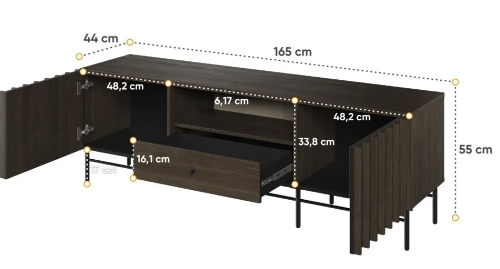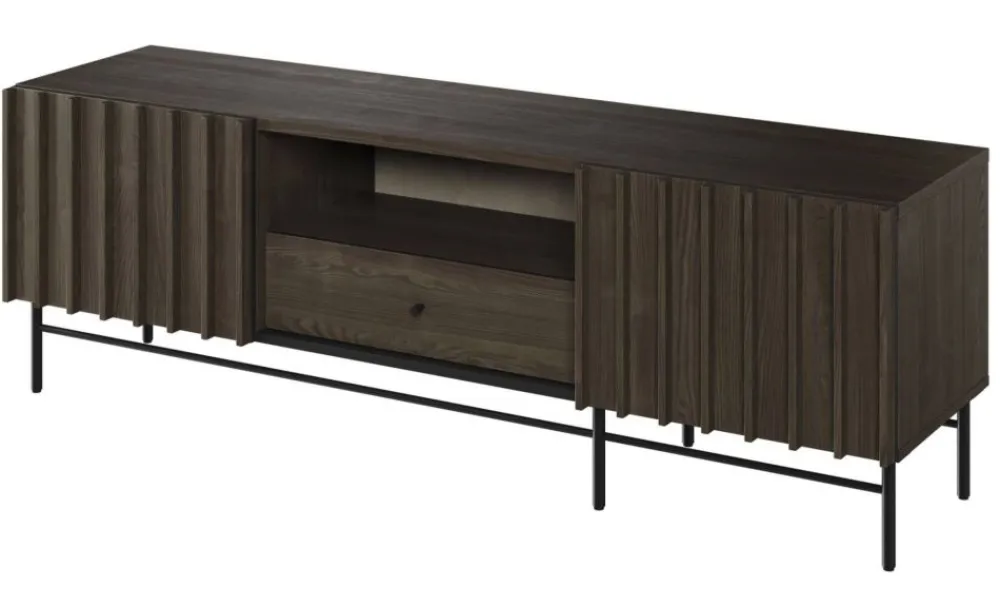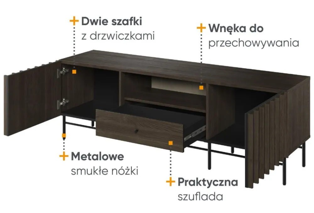 Dzięki swojej kompaktowej konstrukcji doskonale nadaje się do małych i większych przestrzeni. Pomieści Twoje sprzęty RTV, a jednocześnie nie zajmie zbyt wiele miejsca. Wyposażona w 1 półkę i 1 szufladę, szafka RTV zapewnia odpowiednią ilość miejsca do przechowywania różnych przedmiotów. Dodatkowo, dwie szafki z drzwiczkami umożliwiają dyskretną organizację i schowanie urządzeń elektronicznych. To nie tylko praktyczne rozwiązanie do przechowywania sprzętów, ale również element dekoracyjny, który nadaje wnętrzu nowoczesnego charakteru. Oferuje idealne połączenie funkcjonalności, estetyki i trwałości.