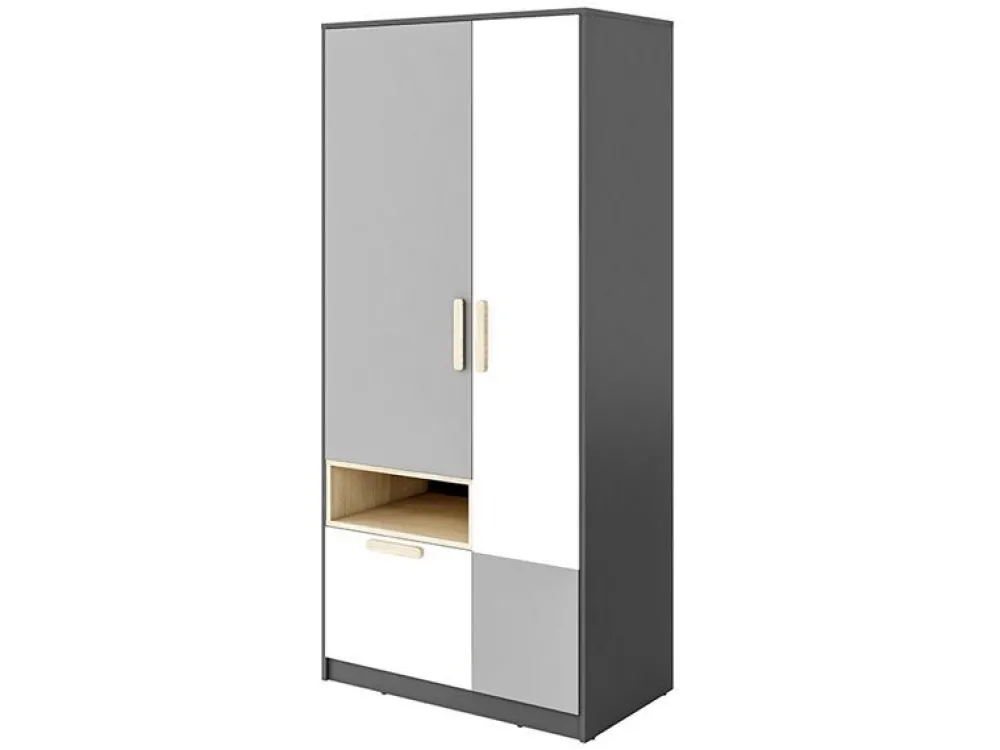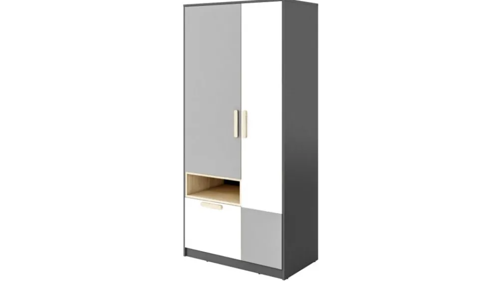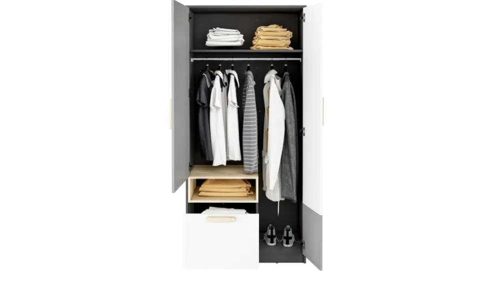 W kolekcji POK znaleźć można kilka wariantów szaf, które dzięki sprytnym rozwiązaniom projektowym doskonale zagospodarują przestrzeń przeznaczoną do przechowania ubrań. Jedną z propozycji jest pojemna szafa dwudrzwiowa. Wnętrze podzielone jest na kilka stref. Znajdziemy tam drążek ubraniowy, a nad nim półkę, głęboką szufladę i otwartą półkę. Całość skomponowana jest zgodnie ze stylizacją geometryczną kolekcji i wraz z innymi elementami stworzy zgrany zestaw