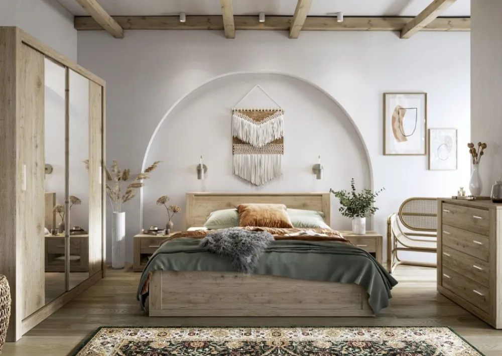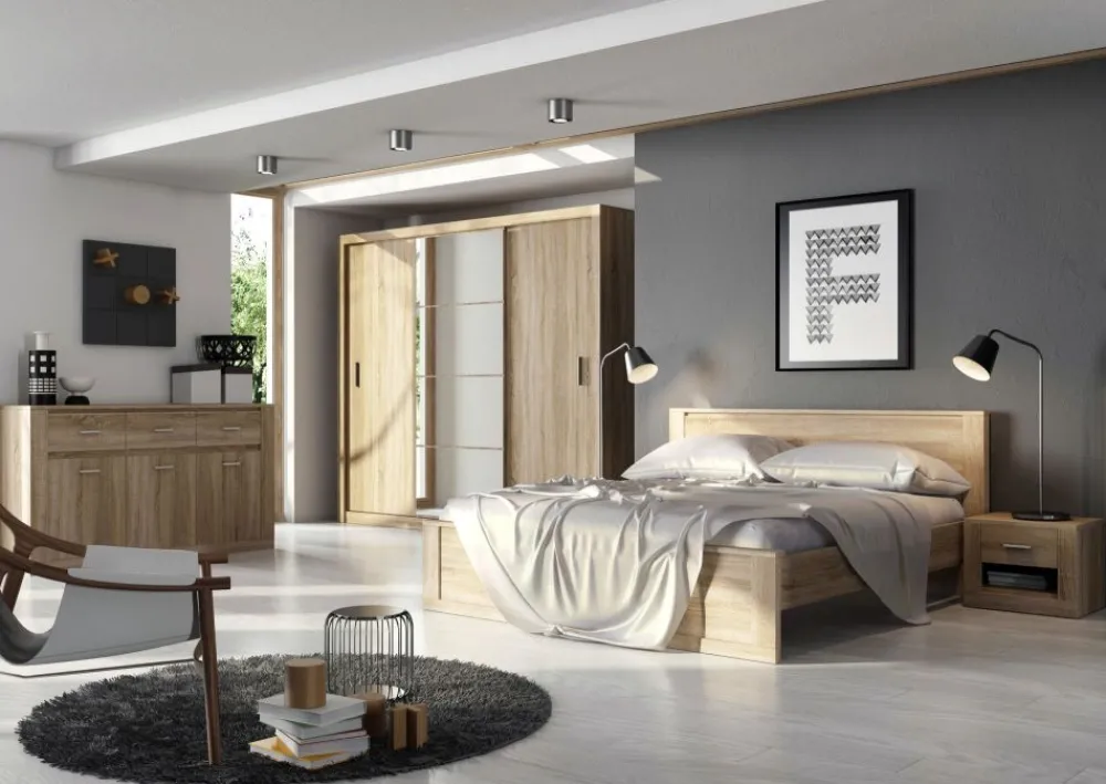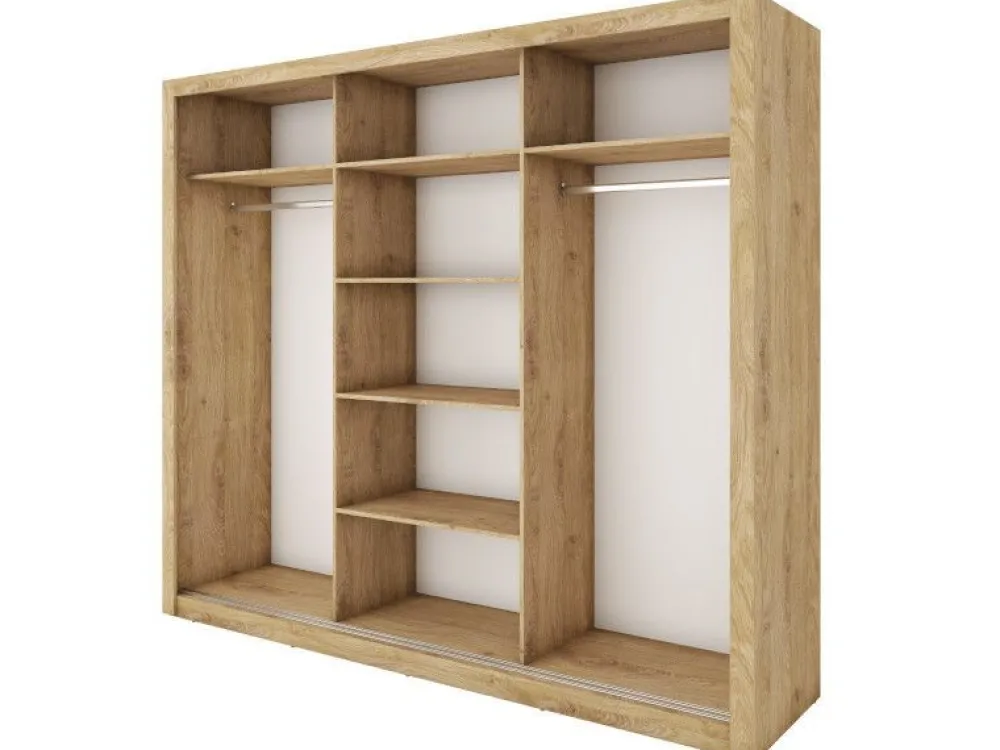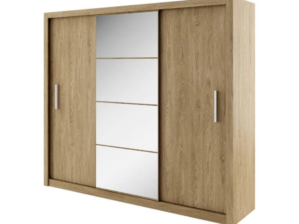 W sypialni nie może zabraknąć pojemnej szafy ubraniowej, prezentowana szafa to model z rozsuwanymi drzwiami, z jednym oszklonym skrzydłem. Lustro optycznie powiększa pomieszczenie – dodatkowo może pomóc przy porannych przymiarkach garderoby. We wnętrzu znajdziemy 2 solidne drążki na ubrania oraz zestaw pojemnych półek. W kolekcji dostępnych jest kilka wielkości szaf z możliwością wyboru frontów.
