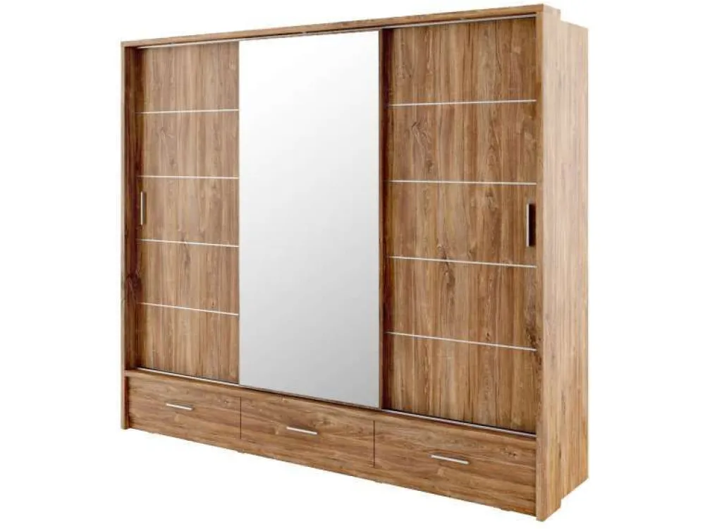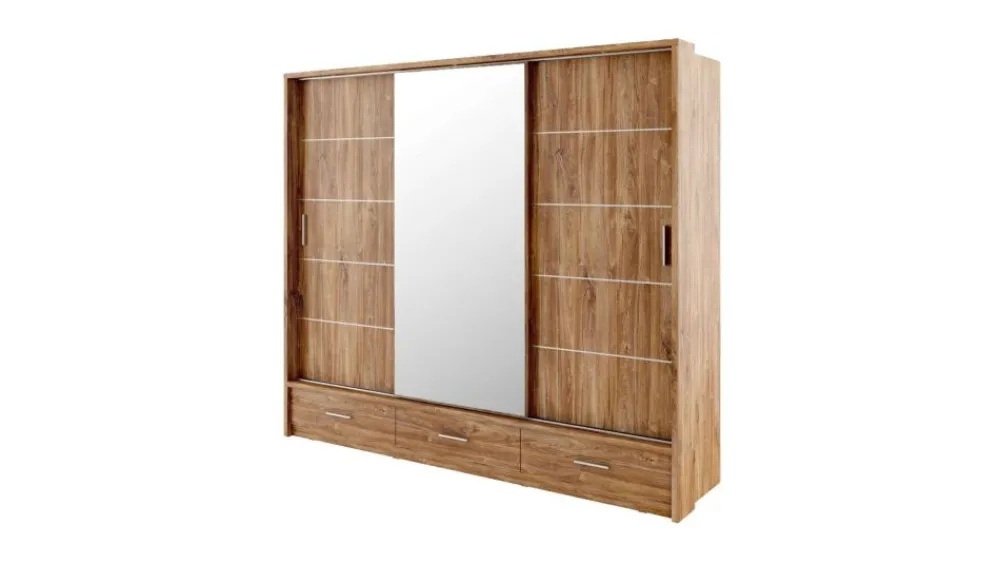 Pojemna szafa trzydrzwiowa z drzwiami przesuwnymi. Na froncie środkowych drzwi znajduje się praktyczne, duże lustro. Wewnątrz znajdują się dwa drążki do zawieszenia odzieży oraz pojemny regał, a także dodatkowe półki w górnej części szafy. Z myślą o wyjątkowo wymagającym użytkowniku przygotowano też trzy zewnętrzne, łatwo dostępne szuflady w dolnej części szafy. Szafa dostępna jest w kilku wersjach kolorystycznych, dzięki czemu dopasujesz ją do wielu różnych wnętrz. Mebel wykonano z wytrzymałej płyty laminowanej z obrzeżami wzmocnionymi ABS.