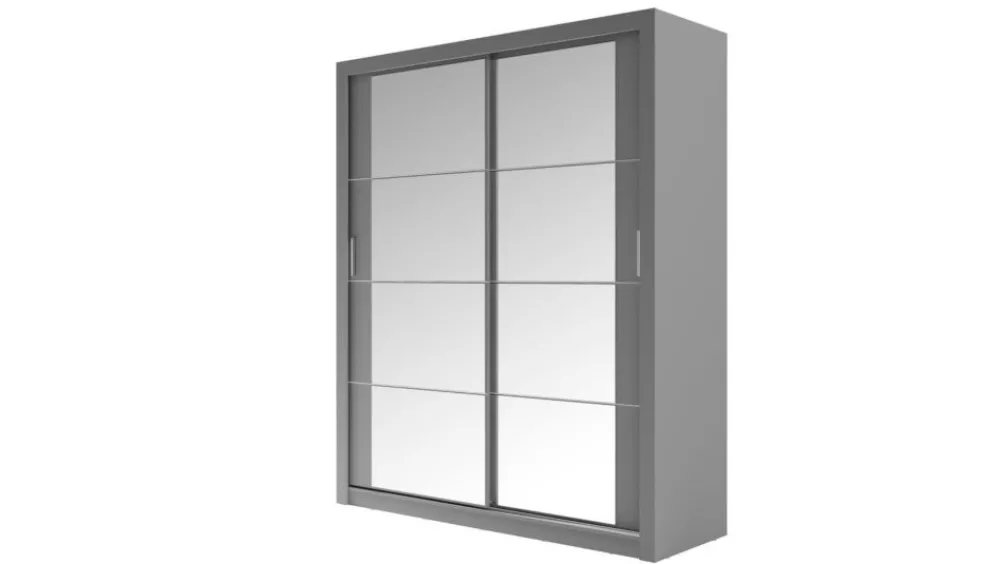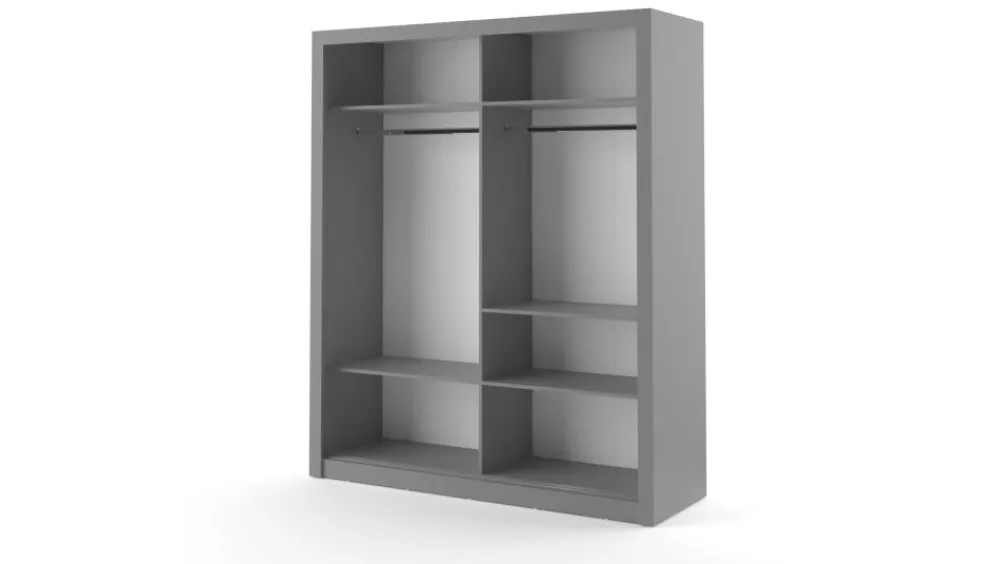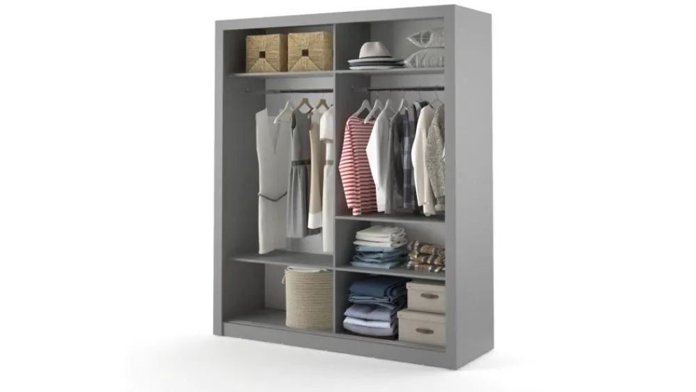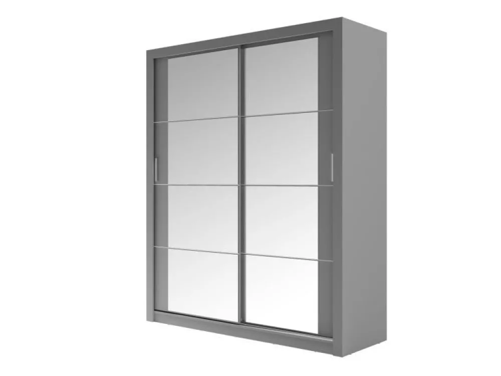 Pojemna szafa dwudrzwiowa z drzwiami przesuwnymi. Na froncie drzwi znajdują się praktyczne, duże lustra. Wewnątrz znajdują się dwa drążki do zawieszenia odzieży oraz pięć pojemnych półek, na których przechowasz pudełka, odzież czy bieliznę. Szafa dostępna jest w kilku wersjach kolorystycznych, dzięki czemu dopasujesz ją do wielu różnych wnętrz. Mebel wykonano z wytrzymałej płyty laminowanej z obrzeżami wzmocnionymi ABS.