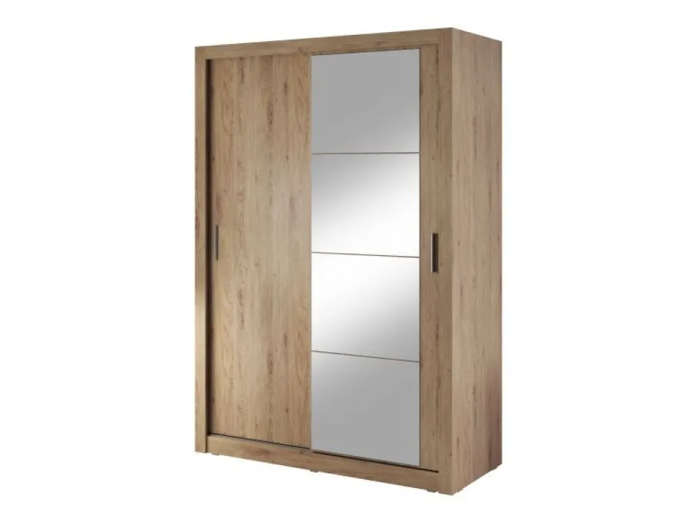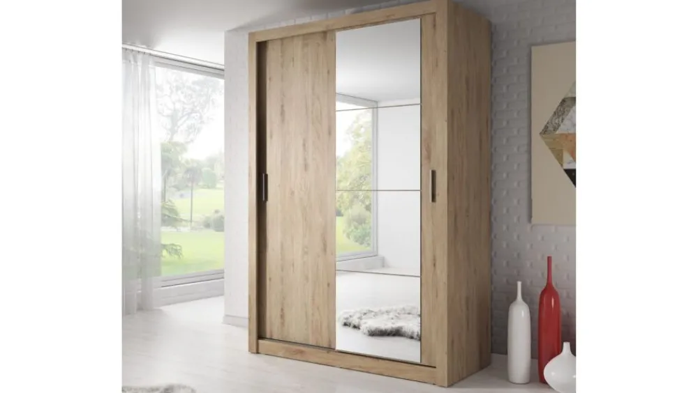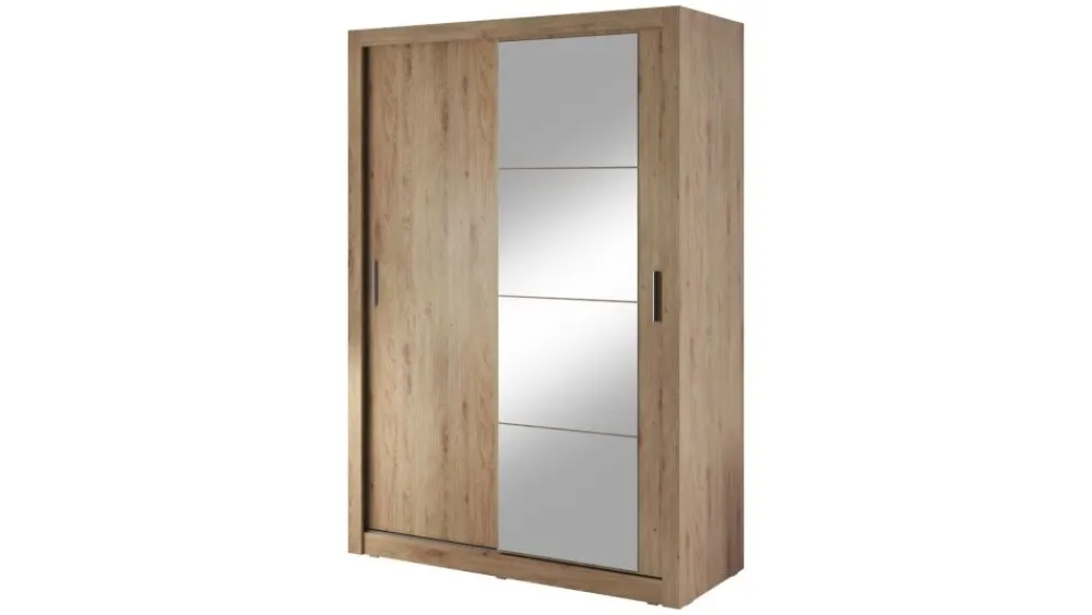 Wąska szafa dwudrzwiowa z drzwiami przesuwnymi. Na froncie drzwi znajduje się praktyczne, duże lustro. Wewnątrz umieszczono drążek do zawieszenia odzieży oraz sześć pojemnych półek, na których przechowasz pudełka, odzież czy bieliznę. Szafa dostępna jest w kilku wersjach kolorystycznych, dzięki czemu dopasujesz ją do wielu różnych wnętrz. Mebel wykonano z wytrzymałej płyty laminowanej z obrzeżami wzmocnionymi ABS.