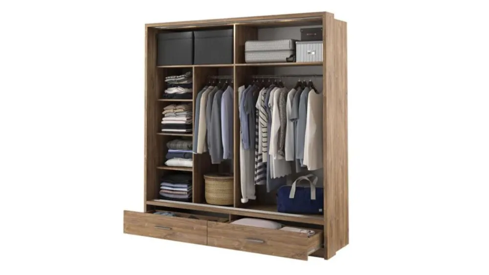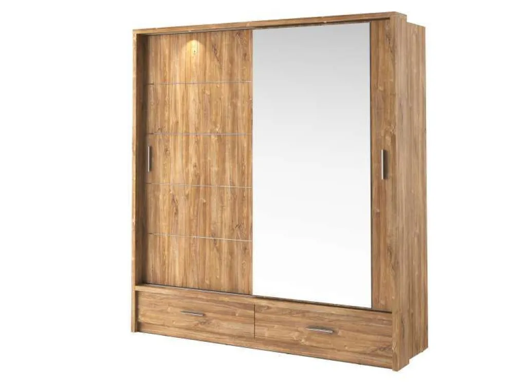 Szafa dwudrzwiowa z drzwiami przesuwnymi. Na froncie drzwi znajduje się praktyczne, duże lustro. Wewnątrz umieszczono dwa drążki do zawieszenia odzieży oraz sześć pojemnych półek, na których przechowasz pudełka, odzież czy bieliznę. Dodatkowo, w dolnej części szafy, znajdują się dwie łatwo dostępne szuflady na drobniejsze przedmioty. Szafa dostępna jest w kilku wersjach kolorystycznych, dzięki czemu dopasujesz ją do wielu różnych wnętrz. Mebel wykonano z wytrzymałej płyty laminowanej z obrzeżami wzmocnionymi ABS.