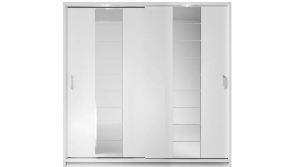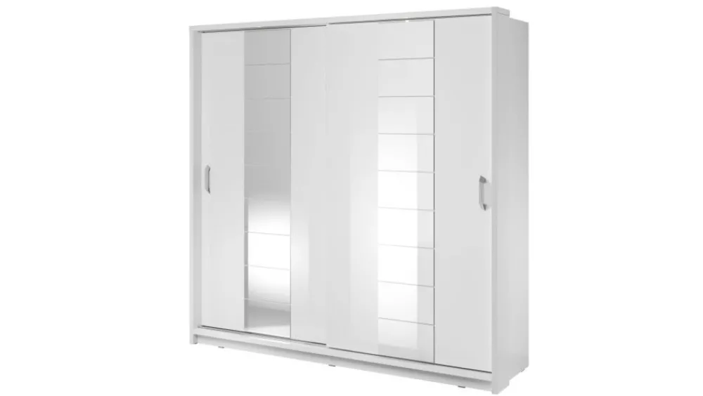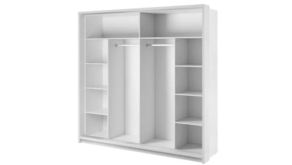 Szafa dwudrzwiowa z drzwiami przesuwnymi. Na froncie drzwi znajdują się praktyczne, duże lustra. Wewnątrz umieszczono dwa drążki do zawieszenia odzieży oraz dwa regały z rzędem pojemnych półek, na których przechowasz pudełka, odzież czy bieliznę. Dodatkowo, w górnej części szafy, znajdują się kolejne półki, na których przechowasz odzież sezonową lub rzadziej używane przedmioty. Szafa dostępna jest w kilku wersjach kolorystycznych, dzięki czemu dopasujesz ją do wielu różnych wnętrz. Mebel wykonano z wytrzymałej płyty laminowanej z obrzeżami wzmocnionymi ABS.