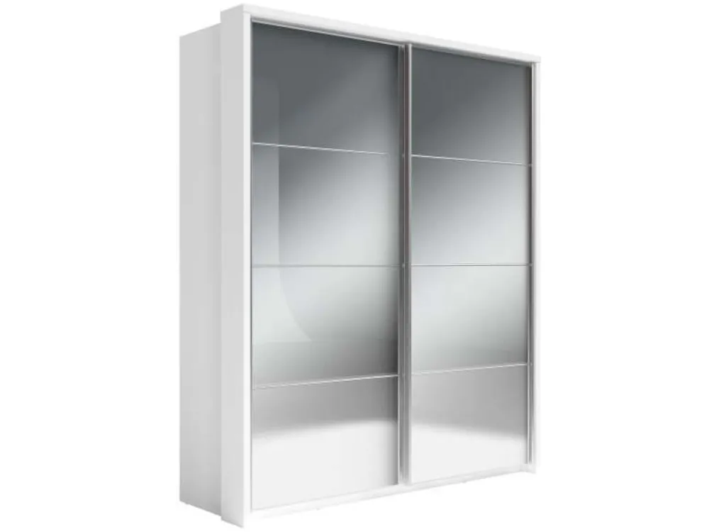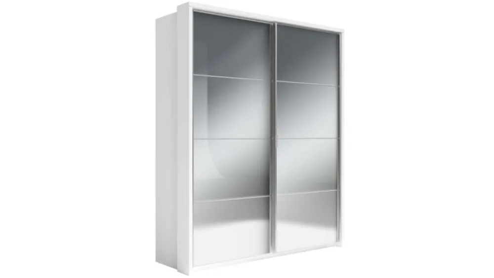 Szafa dwudrzwiowa z drzwiami przesuwnymi. Na froncie drzwi znajdują się praktyczne, duże lustra. Wewnątrz umieszczono trzy drążki do zawieszenia odzieży oraz regał z rzędem pojemnych półek, na których przechowasz pudełka, odzież czy bieliznę. Dodatkowo, w górnej części szafy, znajduje się kolejna półka, na której przechowasz odzież sezonową lub rzadziej używane przedmioty. Szafa dostępna jest w kilku wersjach kolorystycznych, dzięki czemu dopasujesz ją do wielu różnych wnętrz. Mebel wykonano z wytrzymałej płyty laminowanej z obrzeżami wzmocnionymi ABS.