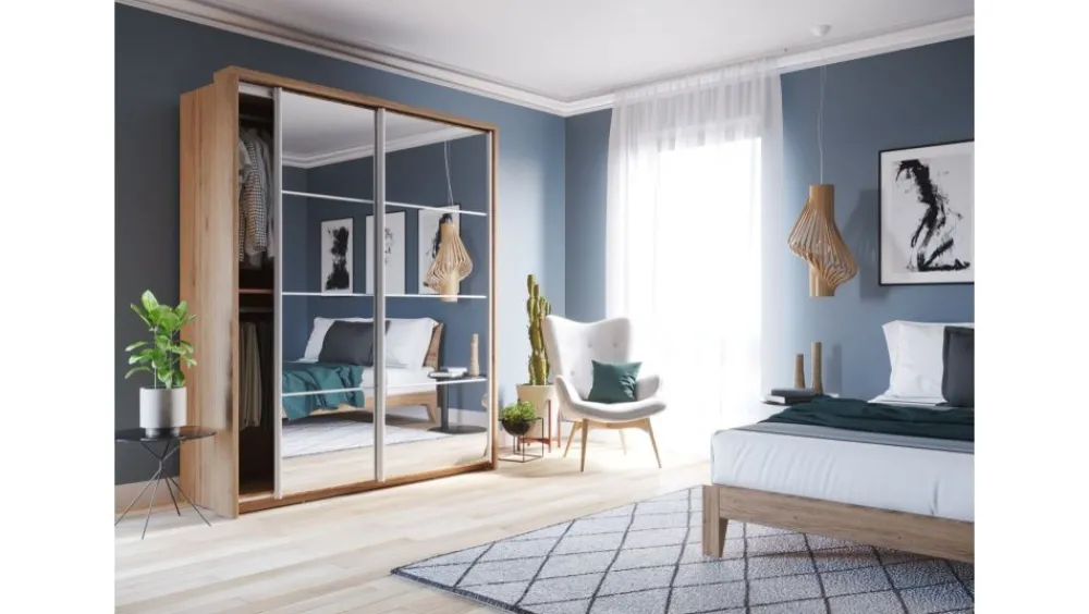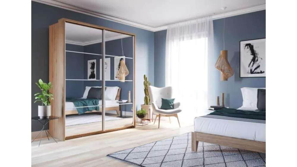 Szafa dwudrzwiowa z drzwiami przesuwnymi. Na froncie drzwi znajdują się praktyczne, duże lustra. Wewnątrz umieszczono trzy drążki do zawieszenia odzieży oraz regał z rzędem pojemnych półek, na których przechowasz pudełka, odzież czy bieliznę. Dodatkowo, w górnej części szafy, znajduje się kolejna półka, na której przechowasz odzież sezonową lub rzadziej używane przedmioty. Szafa dostępna jest w kilku wersjach kolorystycznych, dzięki czemu dopasujesz ją do wielu różnych wnętrz. Mebel wykonano z wytrzymałej płyty laminowanej z obrzeżami wzmocnionymi ABS.