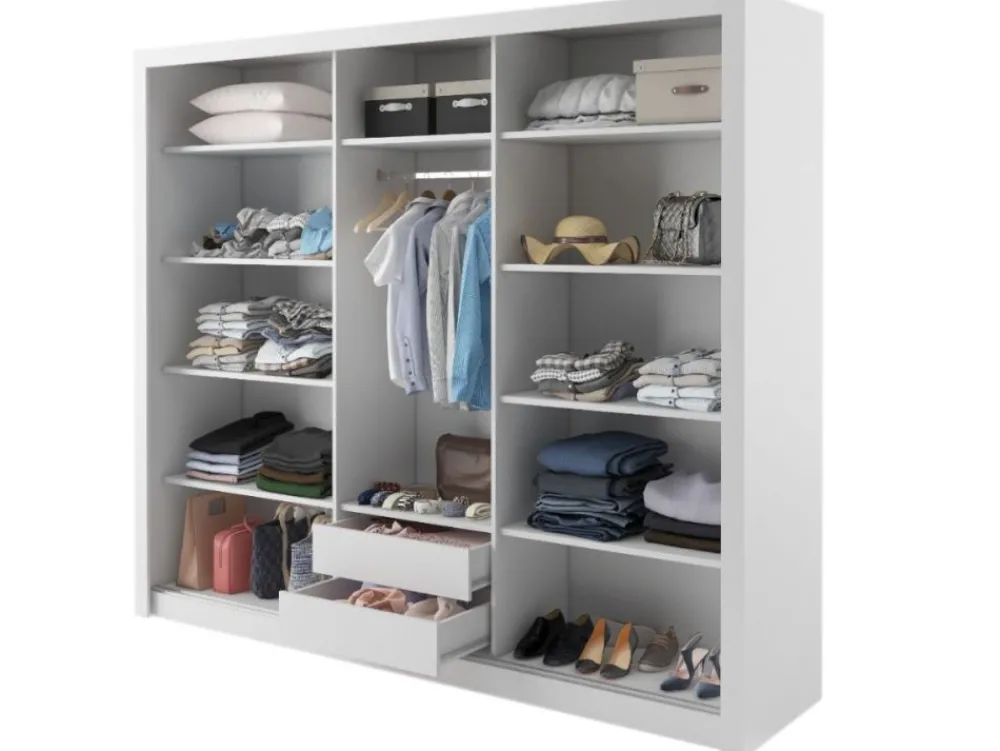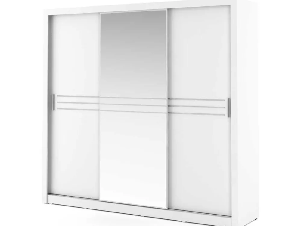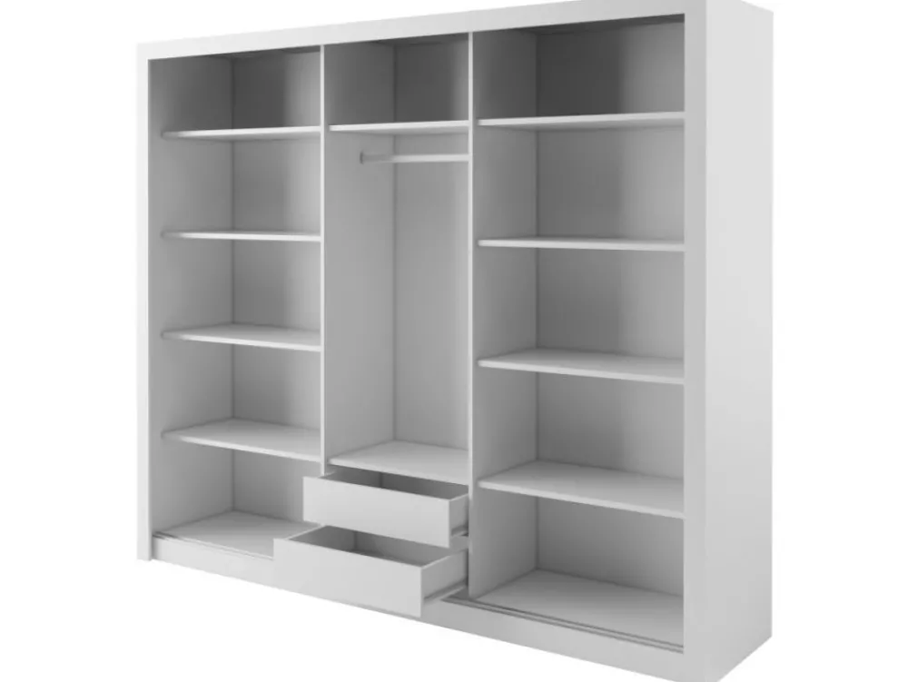 W sypialni nie może zabraknąć pojemnej szafy ubraniowej, prezentowana szafa to model z rozsuwanymi drzwiami oraz z centralnie umiejscowionym lustrem, które to optycznie powiększa pomieszczenie oraz dodatkowo może pomóc przy porannych przymiarkach garderoby. We wnętrzu znajdziemy solidny drążek na ubrania oraz zestaw pojemnych półek i dwie szuflady. W kolekcji Idea dostępnych jest kilka wielkości szaf z możliwością wyboru frontów.
