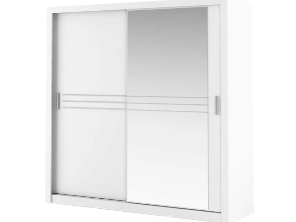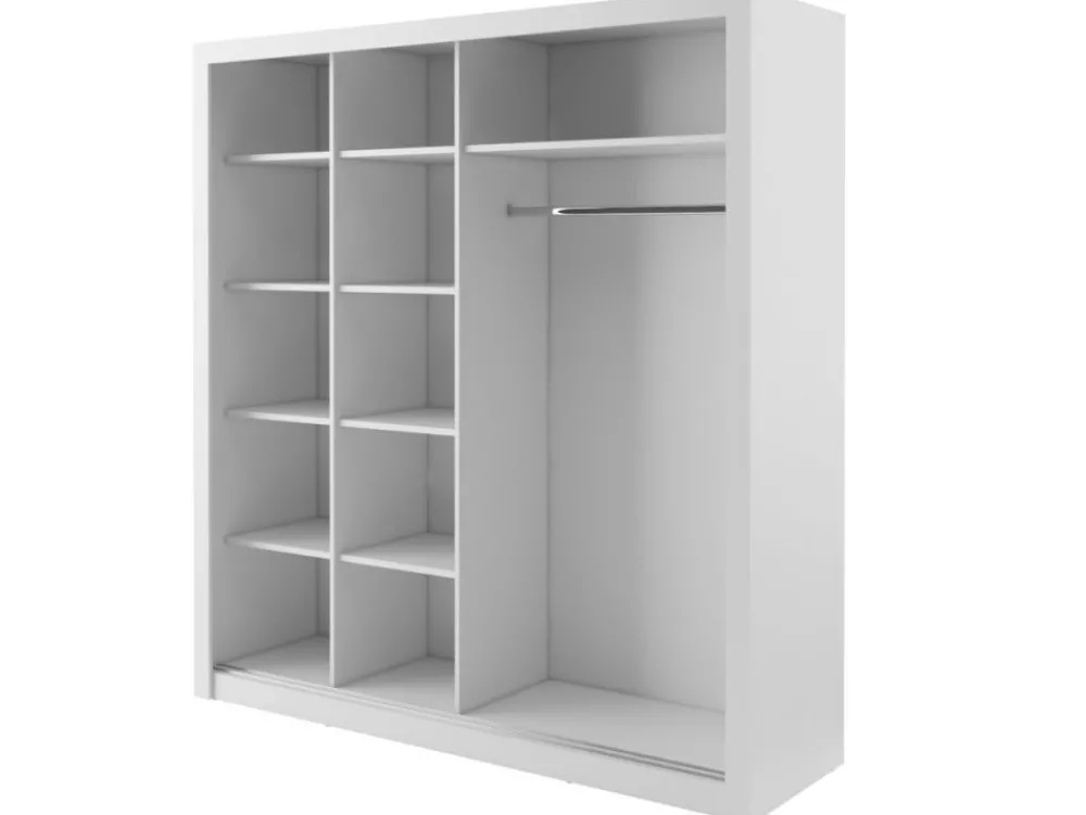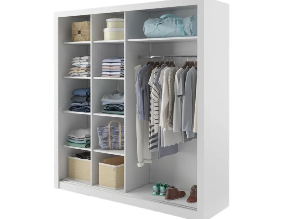 W sypialni nie może zabraknąć pojemnej szafy ubraniowej, prezentowana szafa to model z dwojgiem rozsuwanych drzwi, z czego jedne posiadają lustro, które optycznie powiększa pomieszczenie i dodatkowo może pomóc przy porannych przymiarkach garderoby. We wnętrzu znajdziemy solidny drążek na ubrania oraz zestaw pojemnych półek. W kolekcji Idea dostępnych jest kilka wielkości szaf z możliwością wyboru frontów.