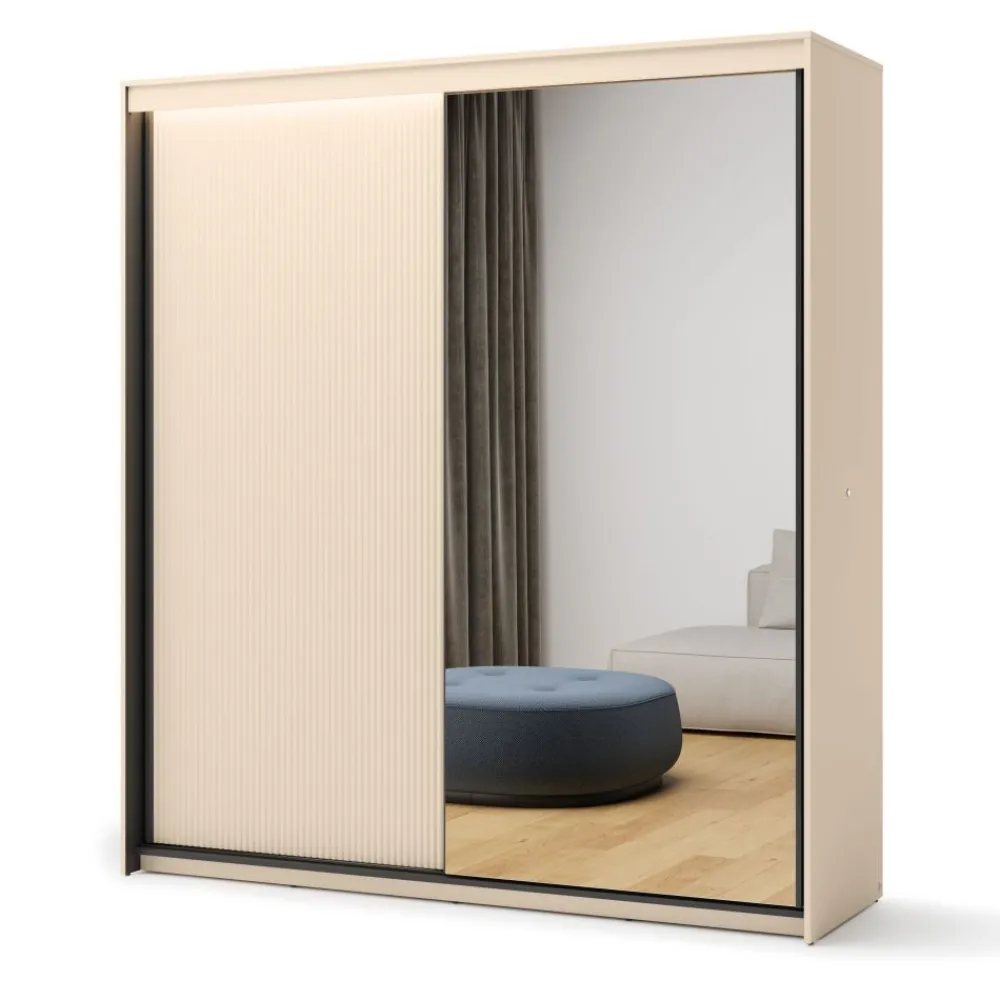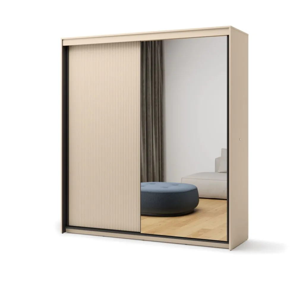 Szafa z lustrem to nie tylko praktyczny, ale i dekoracyjny element każdej sypialni. Duże lustro na froncie odbija światło, optycznie powiększając przestrzeń i dodając jej lekkości. Dzięki niemu codzienne przygotowania staną się wygodniejsze, a wnętrze zyska bardziej przestronny charakter. Połączenie lustra z ryflowanymi frontami nadaje szafie ekskluzywnego wyglądu, który świetnie komponuje się z nowoczesnymi aranżacjami. Przesuwane drzwi zapewniają wygodę użytkowania, pozwalając zaoszczędzić miejsce w pomieszczeniu. To stylowy i praktyczny mebel, który odmieni wygląd Twojej sypialni.