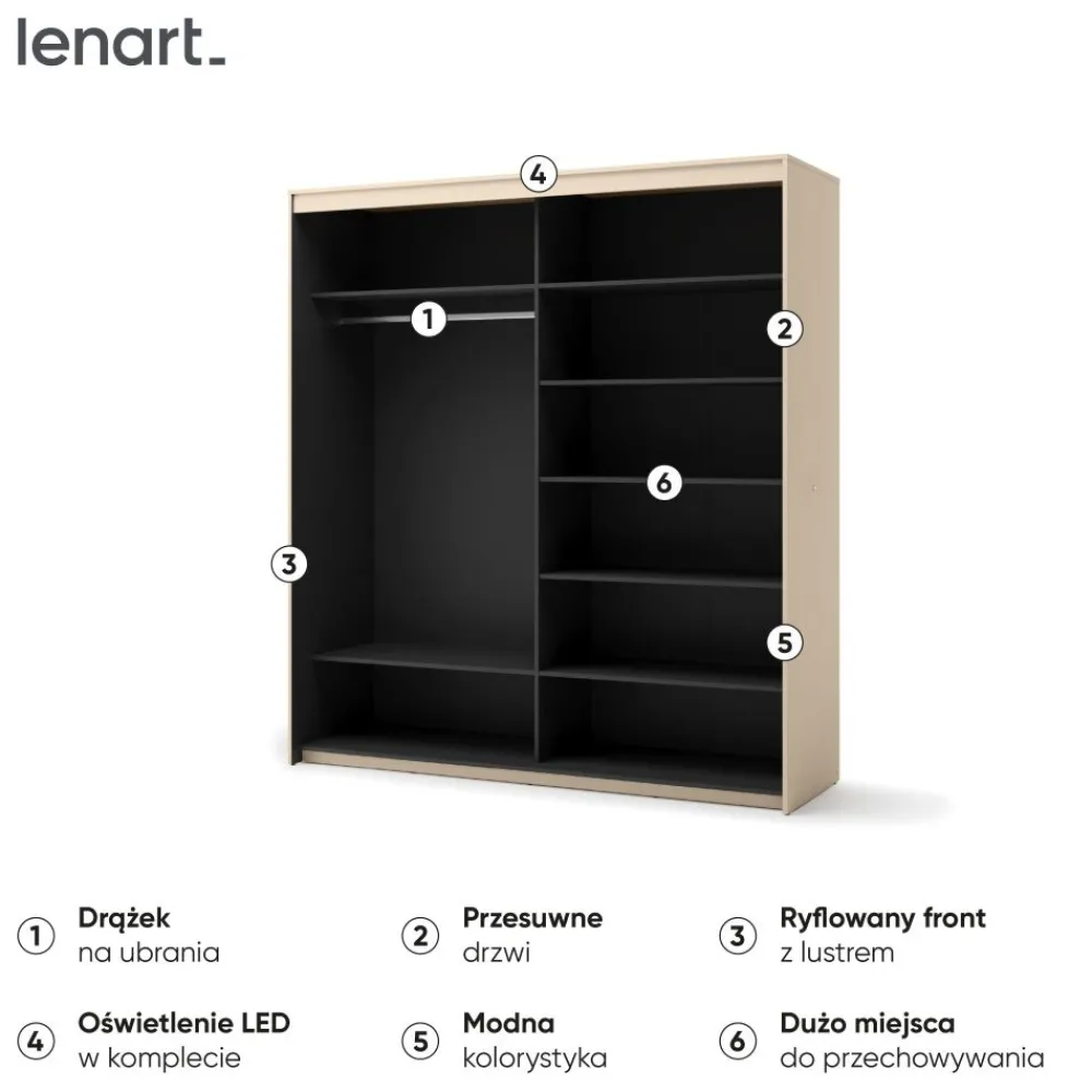 Szafa z oświetleniem to nowoczesne rozwiązanie, które wprowadza do sypialni przytulną atmosferę. Wbudowane diody LED podkreślają eleganckie ryflowane fronty i nadają wnętrzu wyjątkowego charakteru. Dzięki delikatnemu światłu z łatwością znajdziesz potrzebne rzeczy, nawet po zmroku. Oświetlenie LED jest energooszczędne i praktyczne, co pozwala na komfortowe użytkowanie szafy bez dodatkowego oświetlenia w pomieszczeniu. Subtelne podświetlenie nadaje sypialni nowoczesnego wyglądu, podkreślając estetykę mebla. To doskonały wybór dla osób, które cenią sobie elegancję połączoną z funkcjonalnością.