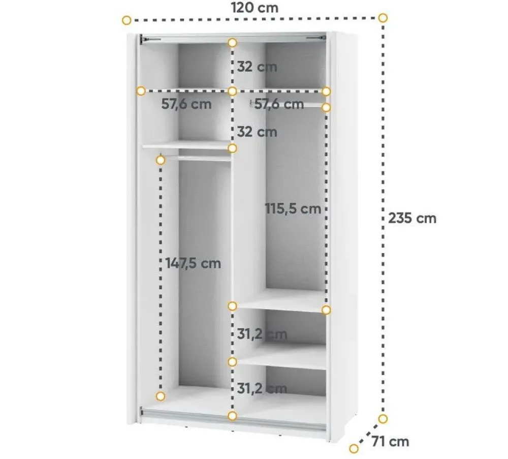 Zaprojektowana z myślą o Twoich potrzebach, szafa o imponującej wysokości 235 cm stworzona została z dbałością o detale. Jej drzwi przesuwne nie tylko oszczędzają miejsce, ale także nadają wnętrzu nowoczesnego charakteru. Dwa drążki na wieszaki oraz pięć półek pozwalają na elastyczną organizację przestrzeni, dostosowując ją do indywidualnych preferencji.