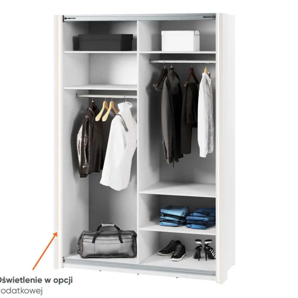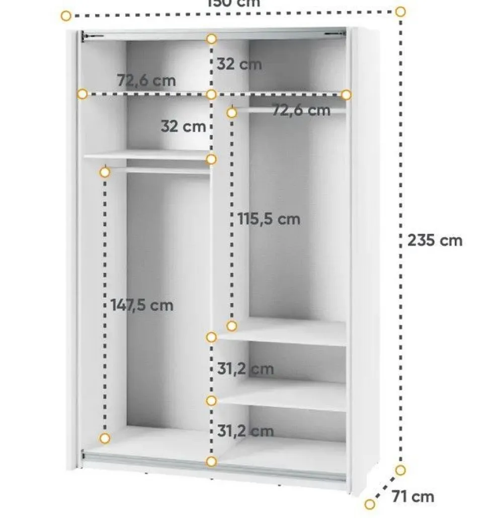 Zaprojektowana z myślą o Twoich potrzebach, szafa o imponującej wysokości 235 cm stworzona została z dbałością o detale. Jej drzwi przesuwne nie tylko oszczędzają miejsce, ale także nadają wnętrzu nowoczesnego charakteru. Dwa drążki na wieszaki oraz pięć półek pozwalają na elastyczną organizację przestrzeni, dostosowując ją do indywidualnych preferencji.
