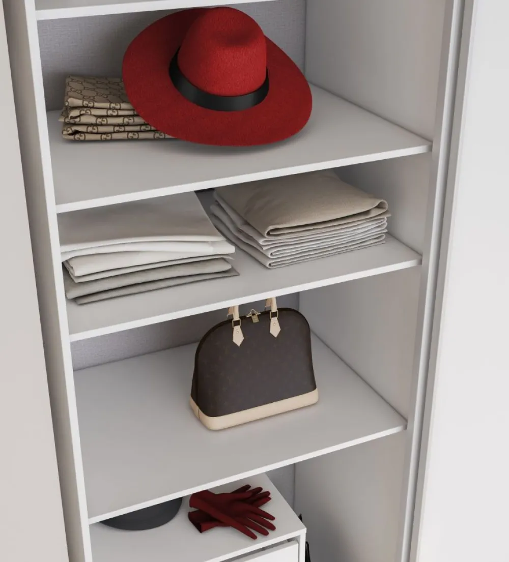 Aby jeszcze bardziej zindywidualizować przestrzeń wewnątrz szafy, proponujemy dodanie pojemnego kontenerka z szufladami oraz dodatkowych półek. Dzięki nim, każdy element garderoby znajdzie swoje idealne miejsce, a codzienne przygotowania do wyjścia staną się przyjemnością.