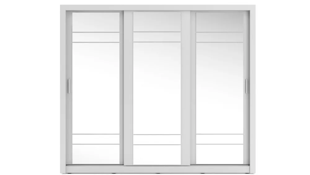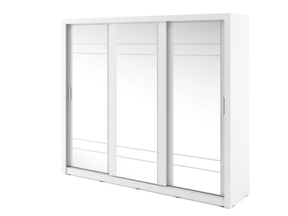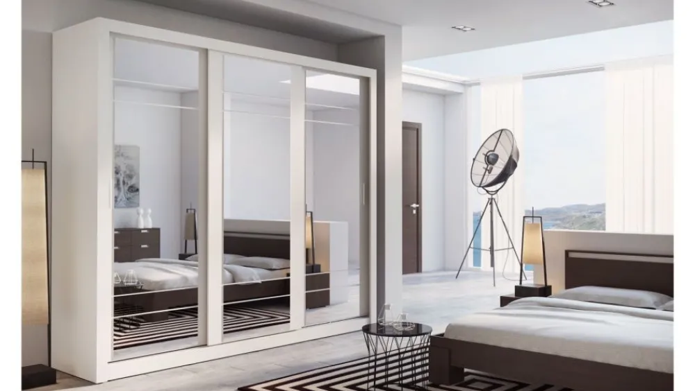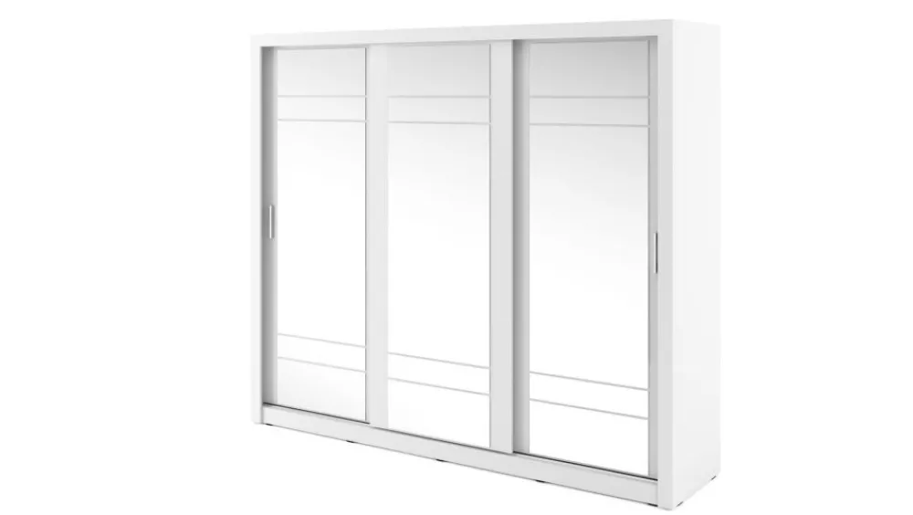 Pojemna szafa trzydrzwiowa z drzwiami przesuwnymi. Na froncie drzwi znajdują się praktyczne, duże lustra. Wewnątrz znajdują się dwa drążki do zawieszenia odzieży oraz pojemny regał, a także dodatkowe półki w górnej części szafy. Szafa dostępna jest w kilku wersjach kolorystycznych, dzięki czemu dopasujesz ją do wielu różnych wnętrz. Mebel wykonano z wytrzymałej płyty laminowanej z obrzeżami wzmocnionymi ABS.
