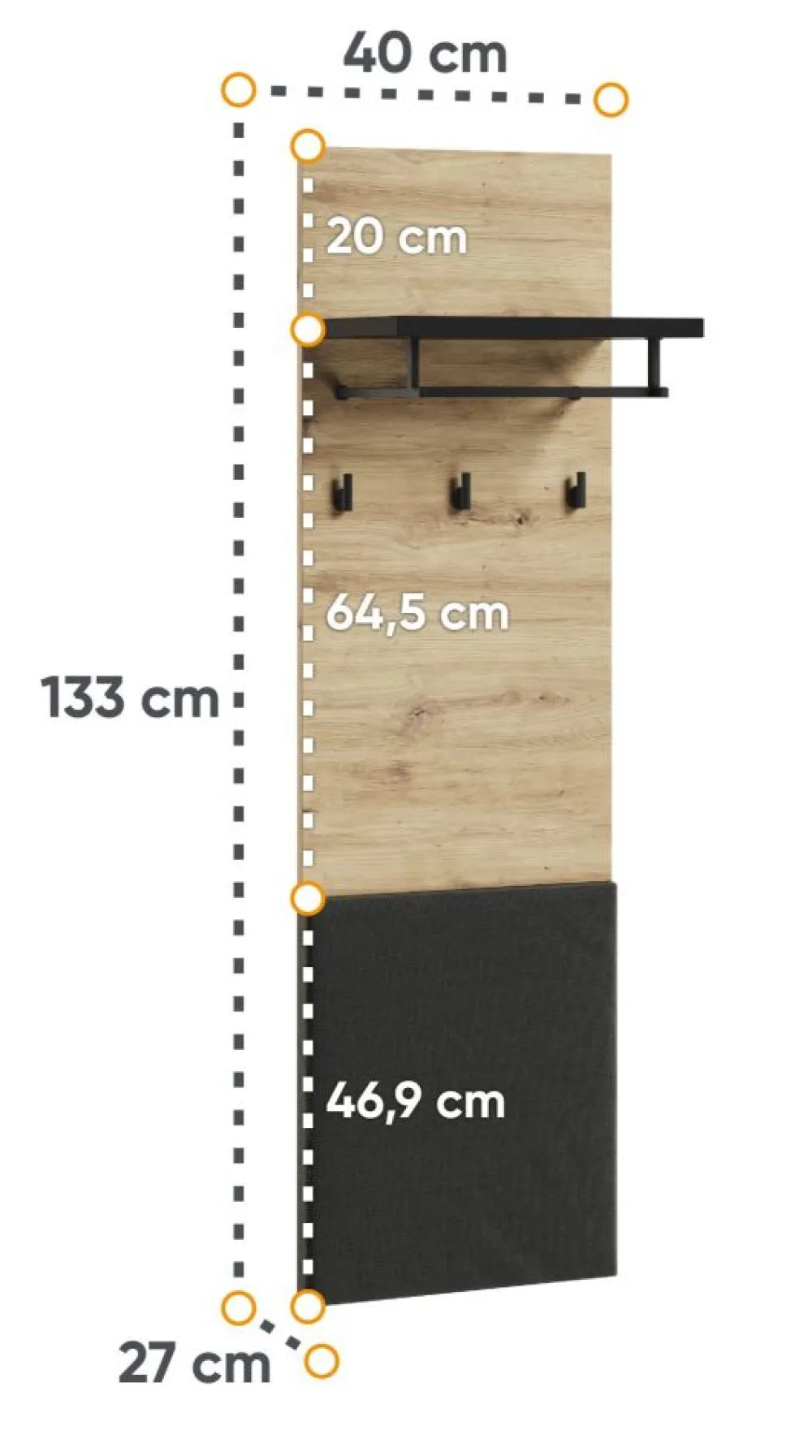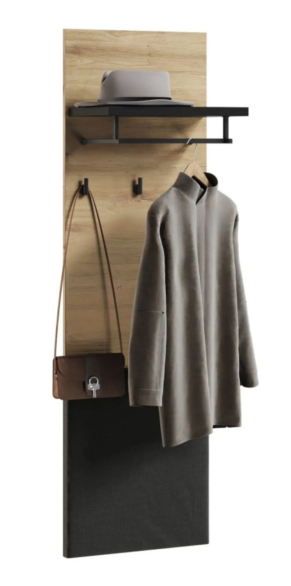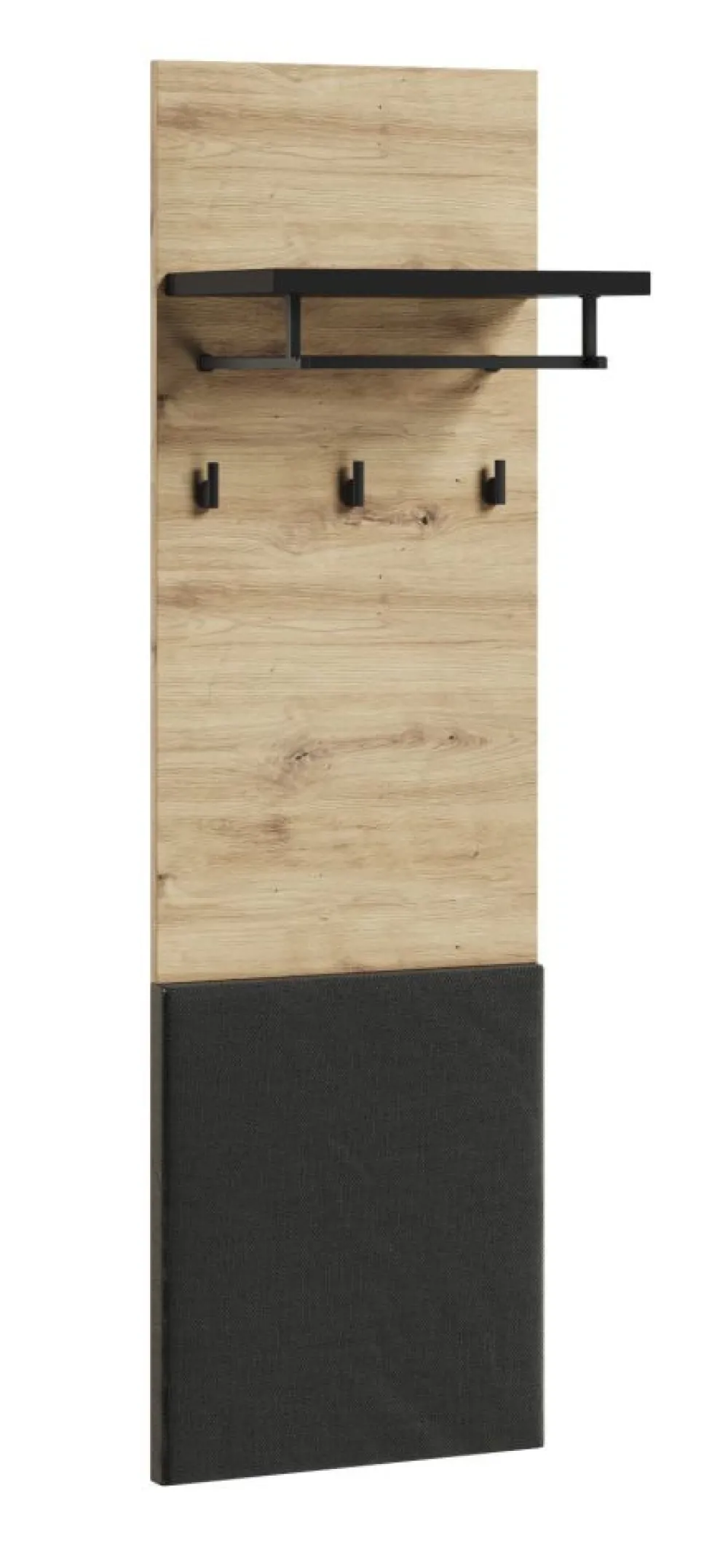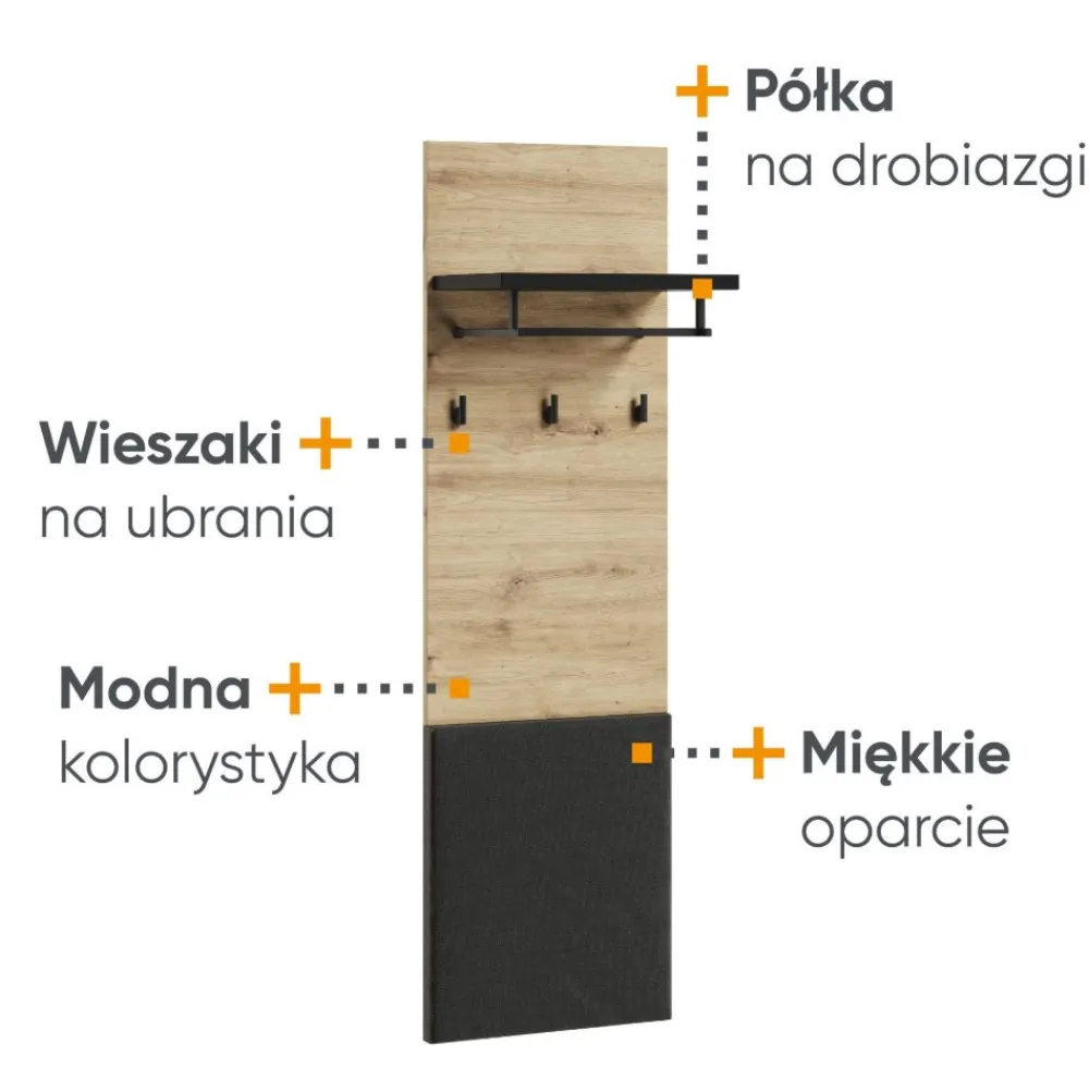 Ten panel ścienny jest prawdziwym rozwiązaniem do przechowywania odzieży wierzchniej. Trzy solidne haczyki są gotowe przyjąć płaszcze, kurtki i inne elementy garderoby, utrzymując porządek w Twoim otoczeniu. Dodatkowo, dostępna półka z drążkiem na wieszaki oferuje praktyczną przestrzeń do przechowywania dodatkowych ubrań lub akcesoriów.