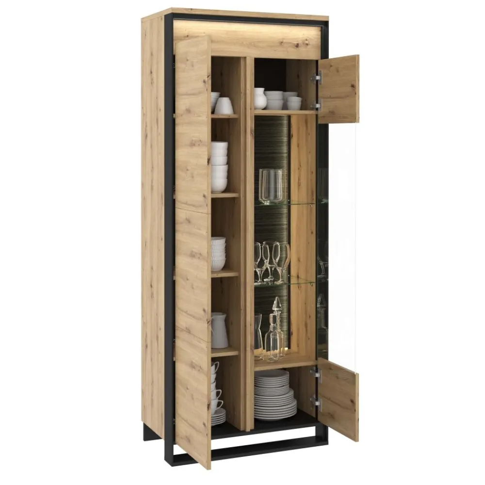 Witryna dwudrzwiowa Quant oferuje po jednej stronie półki niczym w szafie, a po drugie stronie eleganckie szklane półki za taflą szkła – doskonałe do wyeksponowania zastawy stołowej, kieliszków, bibelotów itp. Witryna posiada dwa rodzaje oświetlenia ledowego – zewnętrzne, ozdobne, w górnej części mebla (dostępne w komplecie) oraz wewnętrzne, umieszczone w części przeszklonej ( jako opcja dodatkowa). Witrynę wykonano z wytrzymałej płyty laminowanej wykończonej trwałym obrzeżem ABS. Komfortowe użytkowanie wspomaga mechanizm PUSH TO OPEN.