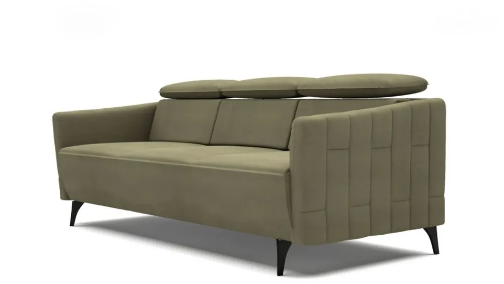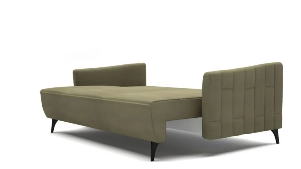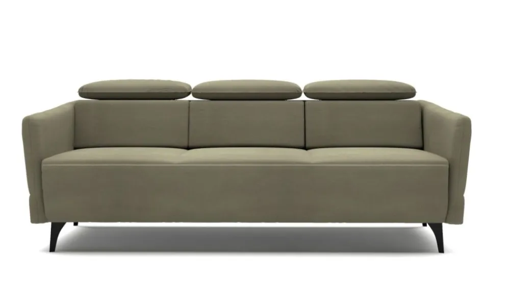 Kanapa Fuga to nowoczesny mebel dla wymagających. Nowoczesna bryła o geometrycznych kształtach to propozycja dla zwolenników prostoty i minimalizmu. Surowość kształtów przełamują lekko odchylone na zewnątrz podłokietniki, dzięki czemu mebel nabiera lekkości, podkreślonej dodatkowo przez smukłe, wysokie nóżki. Stylowa giza oraz oryginalne przeszycia na boczkach nadają sofie niepowtarzalnego charakteru. Dodatkowy komfort zapewnią Ci regulowane zagłówki, a wbudowana funkcja spania typu DL wraz z pojemnikiem na pościel pozwolą, w razie potrzeby, zamienić sofę w wygodne miejsce do nocnego odpoczynku, np. kiedy przyjmujesz gości. Wysokie metalowe nóżki w kolorze antracytowym wyglądają niezwykle elegancko, a przy tym dzięki podwyższeniu, ułatwiają utrzymanie czystości pod meblem.